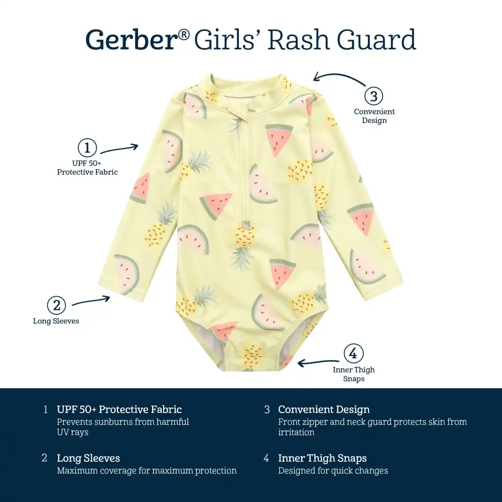 Make sure your adorable lover of water play has a good time at the beach or pool with this rash guard! Fashioned from UPF 50+ fabric to shield against the sun's rays and designed to minimize skin irritation, you can have peace of mind while your baby girl enjoys water fun. Fastened with a secure half-zip and chin guard, your little one can enjoy the day while you have peace of mind that she’s safe. Our essentials have been independently certified with STANDARD 100 by OEKO-TEX® so that you don’t have to worry about harmful substances in your baby’s wardrobe. Includes one rash guard.