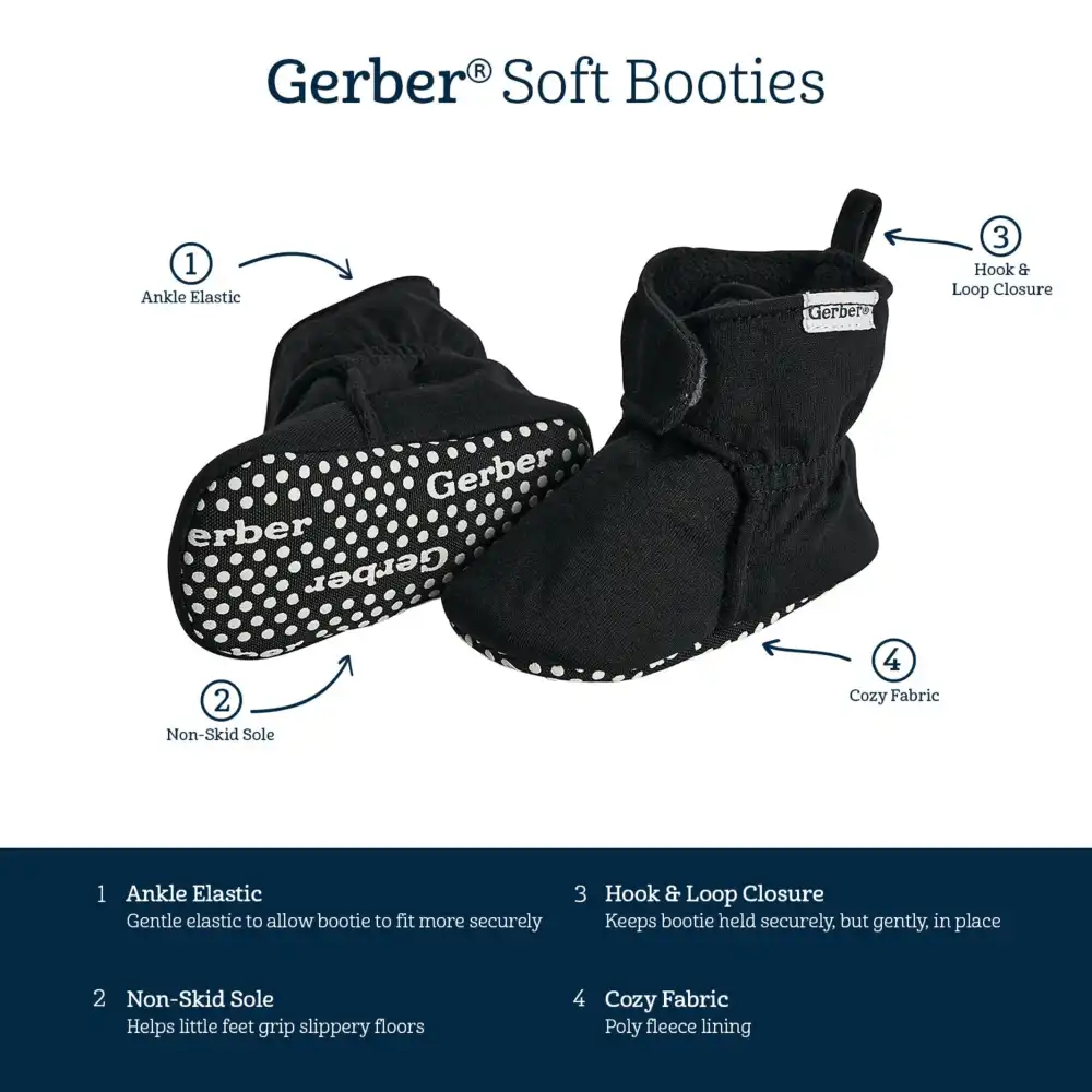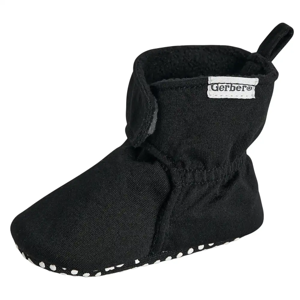 Your baby boy or baby girl will love these comfortable, black booties with poly-fleece lining designed to keep their little feet warm. Featuring a non-skid cotton canvas sole to provide extra balance support and secured with an extra-large hook and loop strap, these baby booties give a comfortably secure feel. A heel loop makes it easy to remove them when needed and minimizes wear and tear on the booties. Our essentials have been independently certified with STANDARD 100 by OEKO-TEX® so that you don’t have to worry about harmful substances in your baby’s wardrobe. This pack includes one pair of booties.