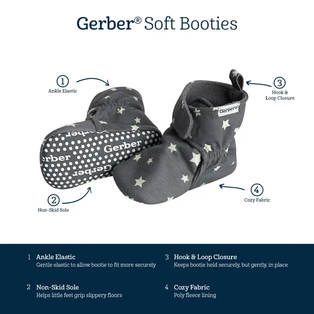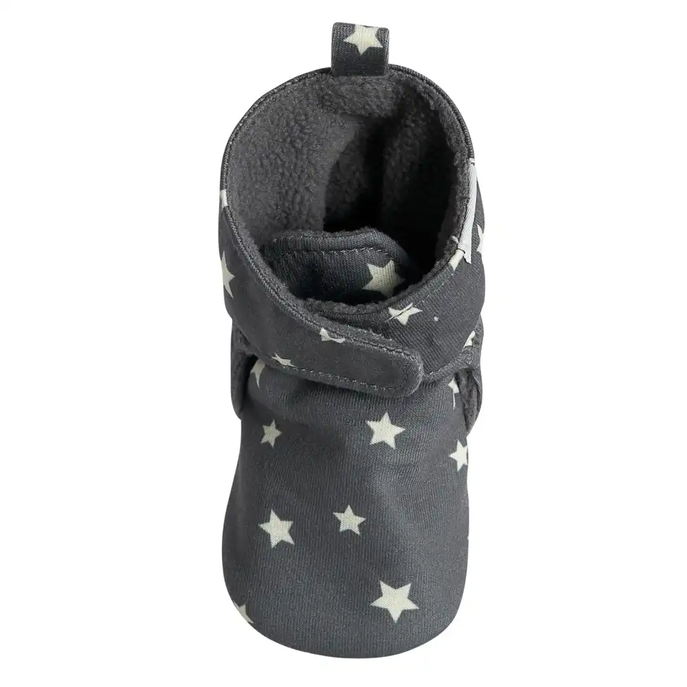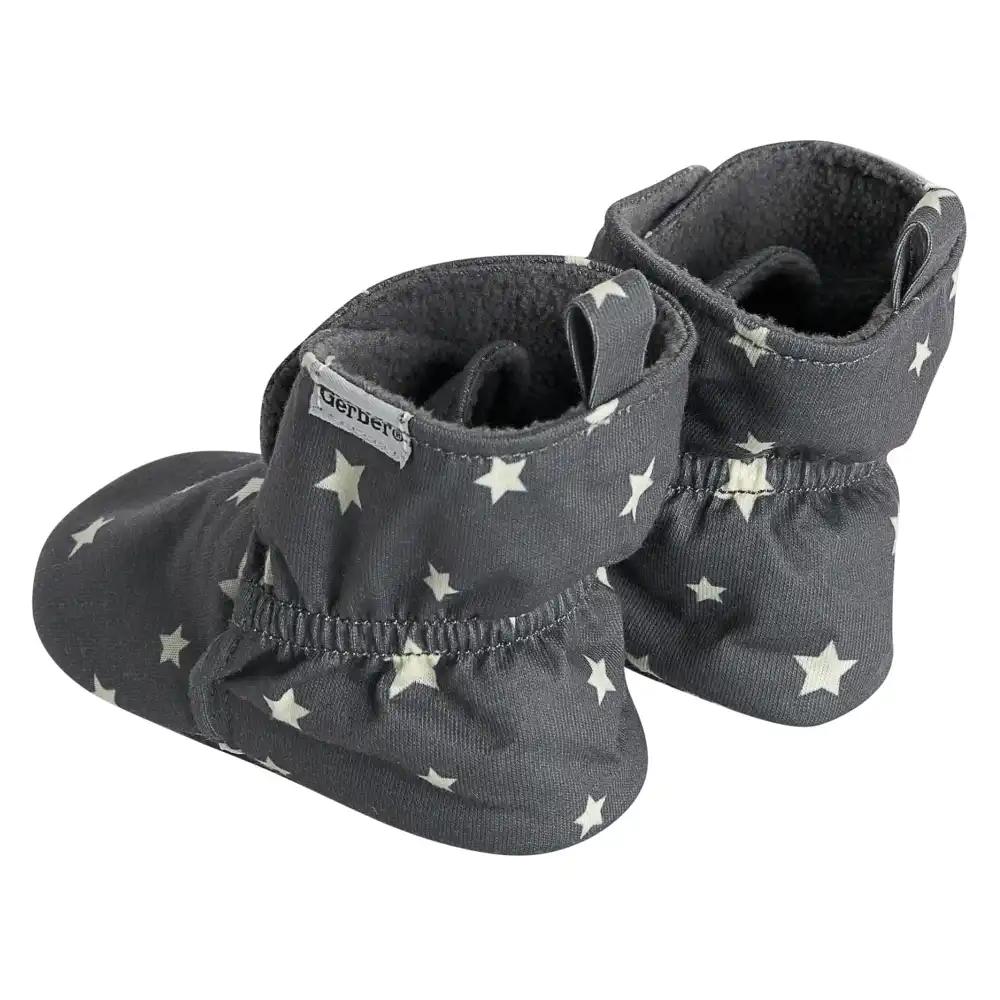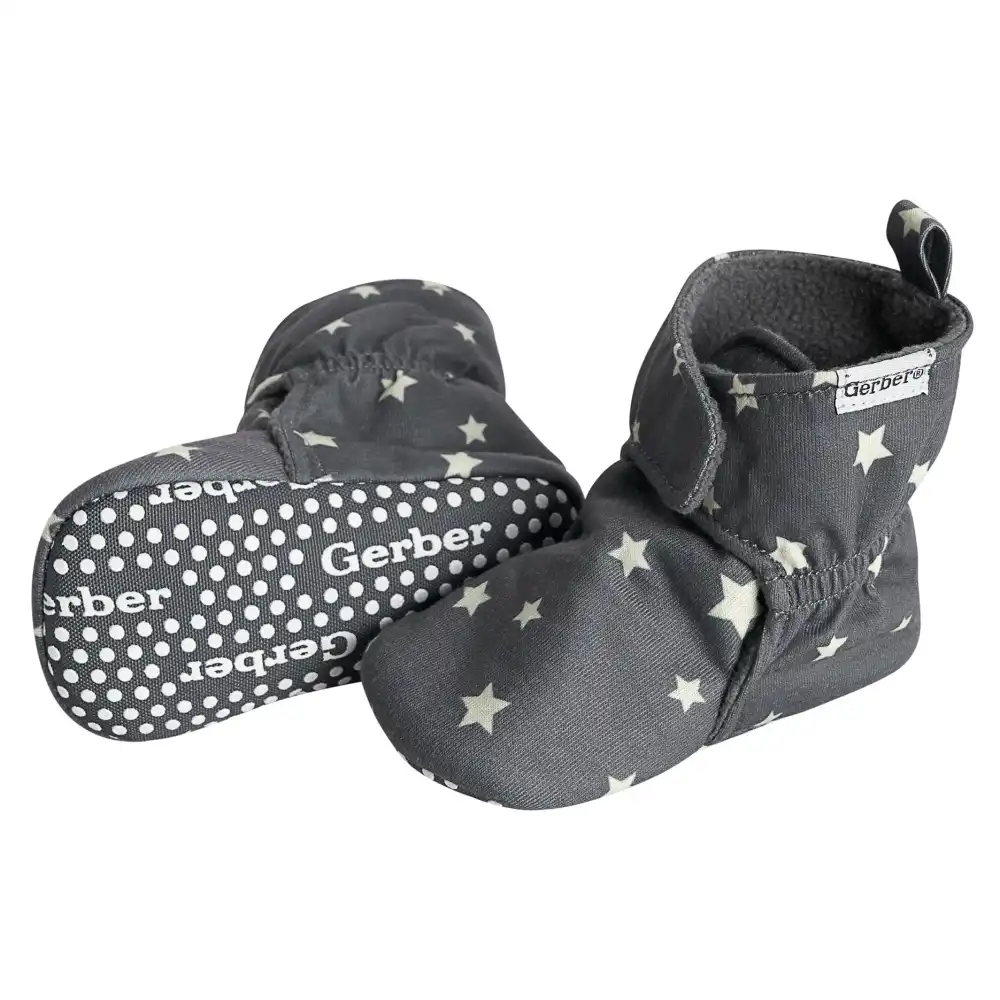 Your baby girl or baby boy will love these gray, gender-neutral booties with white star pattern and poly-fleece lining designed to keep their little feet warm. Featuring a non-skid cotton canvas sole to provide extra balance support and secured with an extra-large hook and loop strap, these baby booties give a comfortably secure feel. A heel loop makes it easy to remove them when needed and minimizes wear and tear on the booties. Our essentials have been independently certified with STANDARD 100 by OEKO-TEX® so that you don’t have to worry about harmful substances in your baby’s wardrobe. This pack includes one pair of booties.