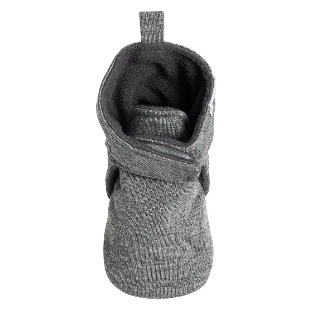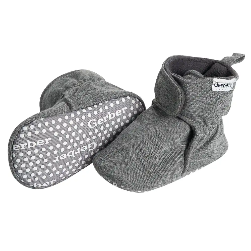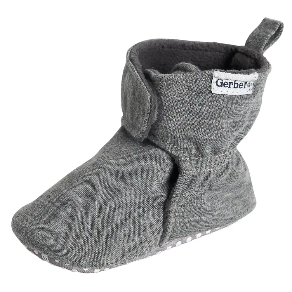 Your baby girl or baby boy will love these gray, gender-neutral booties with poly-fleece lining designed to keep their little feet warm. Featuring a non-skid cotton canvas sole to provide extra balance support and secured with an extra-large hook and loop strap, these baby booties give a comfortably secure feel. A heel loop makes it easy to remove them when needed and minimizes wear and tear on the booties. Our essentials have been independently certified with STANDARD 100 by OEKO-TEX® so that you don’t have to worry about harmful substances in your baby’s wardrobe. This pack includes one pair of booties.