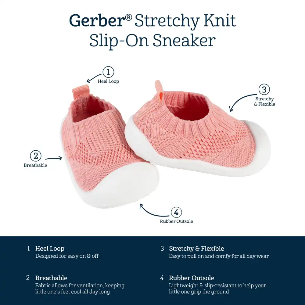Toddler shoes have to keep up with adventurous little ones. Made from a soft, comfort stretch knit material with rubber soles for support, your toddler girl will ready for whatever the day brings! Pack includes one pair of pink slip-on shoes.