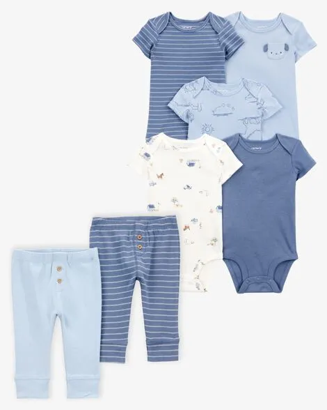 Baby 7-Piece Short-Sleeve Bodysuits & Pull-On Pants Set - Blue
