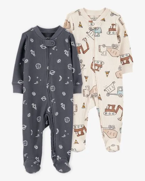 Baby 2-Pack Cotton 2-Way Zip Sleep & Play Pajamas - Grey/Ivory