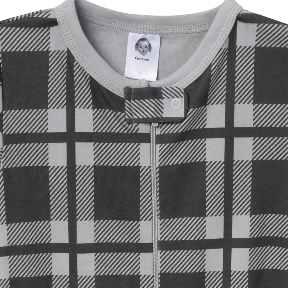 Baby and toddler boys who love the great outdoors will enjoy the cozy comfort this 2-pack of pajamas provides after a day full of adventure. Featuring one gray plaid pajama and another with an adorable moose print, these pajamas capture the spirit of nature, making bedtime feel like a wilderness retreat. Crafted primarily from soft cotton, they provide a breathable feel that keeps your little one snug throughout the night. The two-way zipper with a neckline guard ensures easy dressing and quick diaper changes, while the non-skid soles offer extra traction for safe, confident steps. With spandex trim at the neckline and wrists, these pajamas offer a flexible, secure fit that moves with him. Designed with a tight-fitting style for safe wear, our cozy pajamas are the perfect end to an active day. Our essentials have been independently certified with STANDARD 100 by OEKO-TEX® so that you don’t have to worry about harmful substances in your baby’s wardrobe. Pack includes two snug fitting footed pajamas.