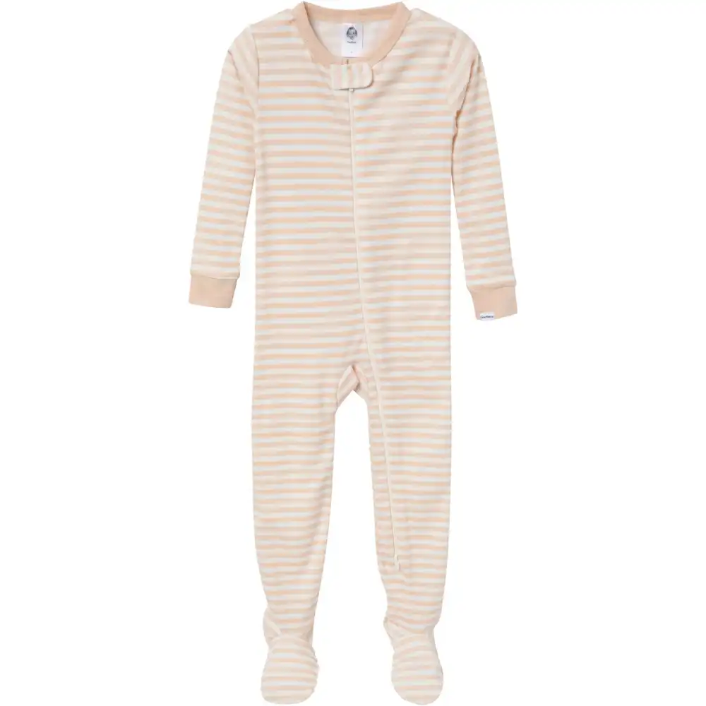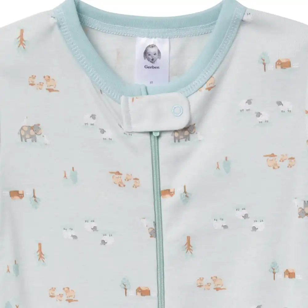 These baby pajamas or toddler pajamas are a delightful choice for little ones who learning farm animal sounds, offering the perfect blend of comfort and fun after a busy day of play. Made primarily from soft cotton, they provide a breathable feel that keeps your little one cozy all night long. The set includes one in blue decorated with friendly farm animals and another featuring ivory and tan stripes, bringing a touch of countryside charm to bedtime. With a two-way zipper and neckline guard, dressing and diaper changes are quick and easy, while the non-skid soles offer extra traction for safe steps. The spandex trim at the neckline and wrists ensures a flexible, secure feel, and the tight-fitting design promotes safe wear. Our essentials have been independently certified with STANDARD 100 by OEKO-TEX® so that you don’t have to worry about harmful substances in your baby’s wardrobe. Pack includes two snug fitting footed pajamas.