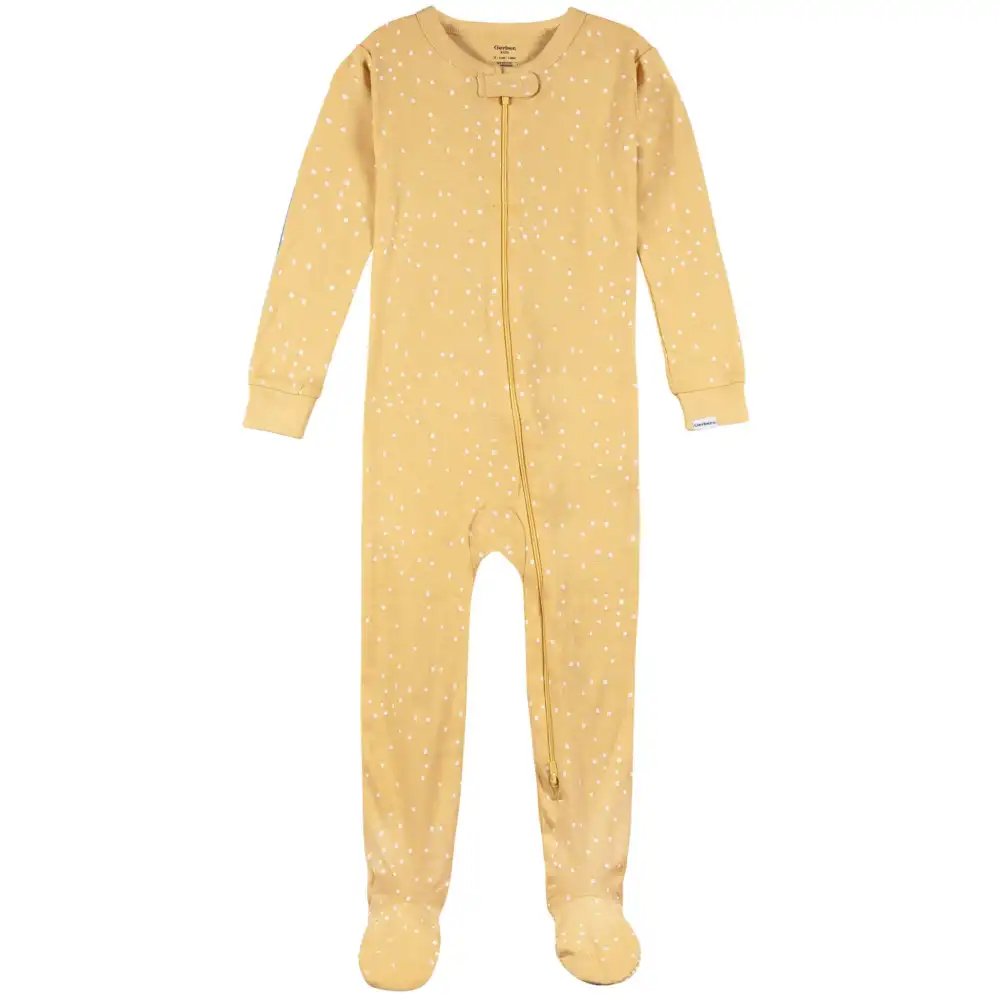 For little ones who love adventures, this 2-pack of baby pajamas or toddler pajamas offers cozy comfort after a day of exploration and play. Made primarily from soft cotton, they provide a breathable feel to keep your little one snug and relaxed throughout the night. The set features one yellow pajama with playful white dots and another cream style with safari animals including cheetahs, elephants, and giraffes, adding an adventurous touch to bedtime. The two-way zipper with a neckline guard ensures easy dressing and quick diaper changes, while the non-skid soles provide extra traction for safe steps. With spandex trim at the neckline and wrists for a flexible, secure fit and a tight-fitting design for safety, these pajamas combine comfort and style, making them an excellent choice for any little explorer. Our essentials have been independently certified with STANDARD 100 by OEKO-TEX® so that you don’t have to worry about harmful substances in your baby’s wardrobe. Pack includes two snug fitting footed pajamas.