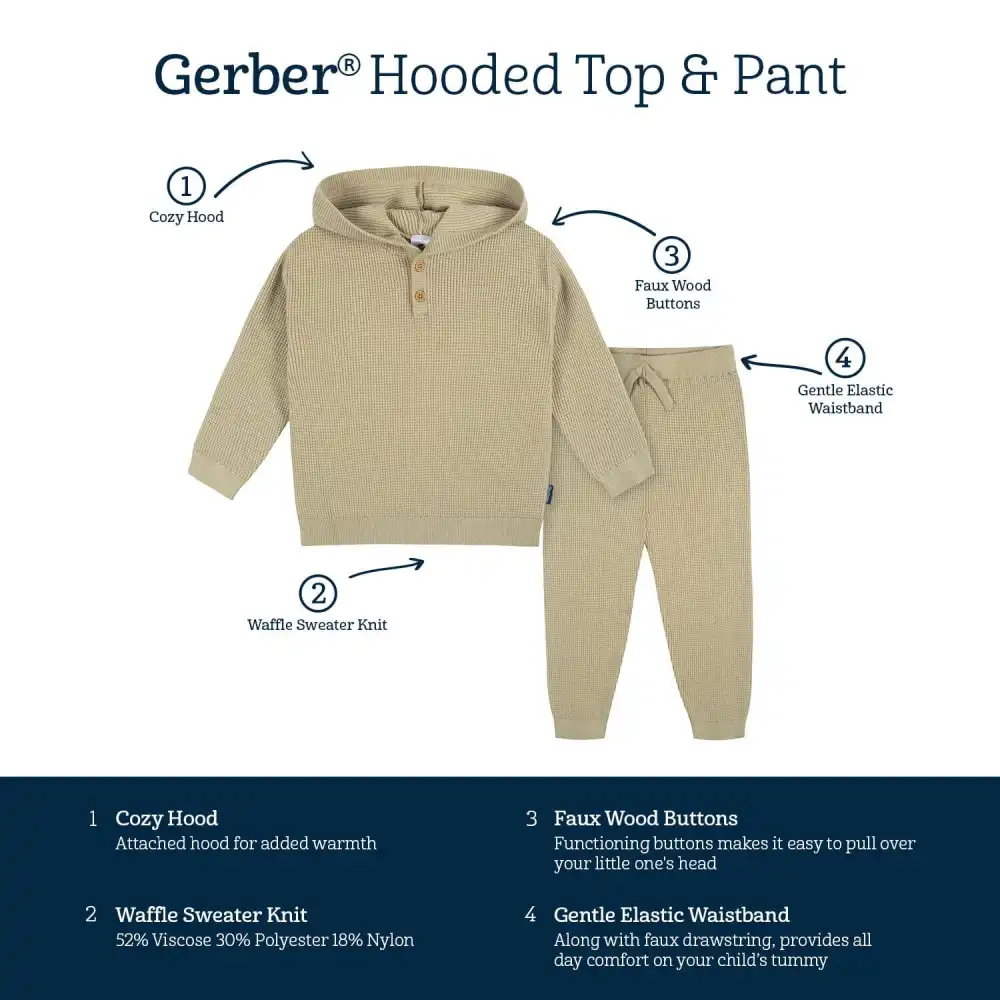 This adorable two-piece, solid tan sweater knit set is perfect for keeping your infant boy cozy and stylish. Made from super soft and comfy fabric, this set features a cozy hoodie for extra warmth and comfort-stretch at the neck, wrists, waist, and ankles. The easy on-off design and relaxed fit is perfect for toddlers learning to dress themselves. The pullover top has two buttons, while the pullup pants feature a stretchy waistband for maximum comfort. The faux wood buttons and drawstring add an extra touch of style to this already adorable set. Our essentials have been independently certified with STANDARD 100 by OEKO-TEX® so that you don’t have to worry about harmful substances in your infant’s wardrobe. This sweater knit set is easy to care for with machine washing/drying and includes one top and one bottom.