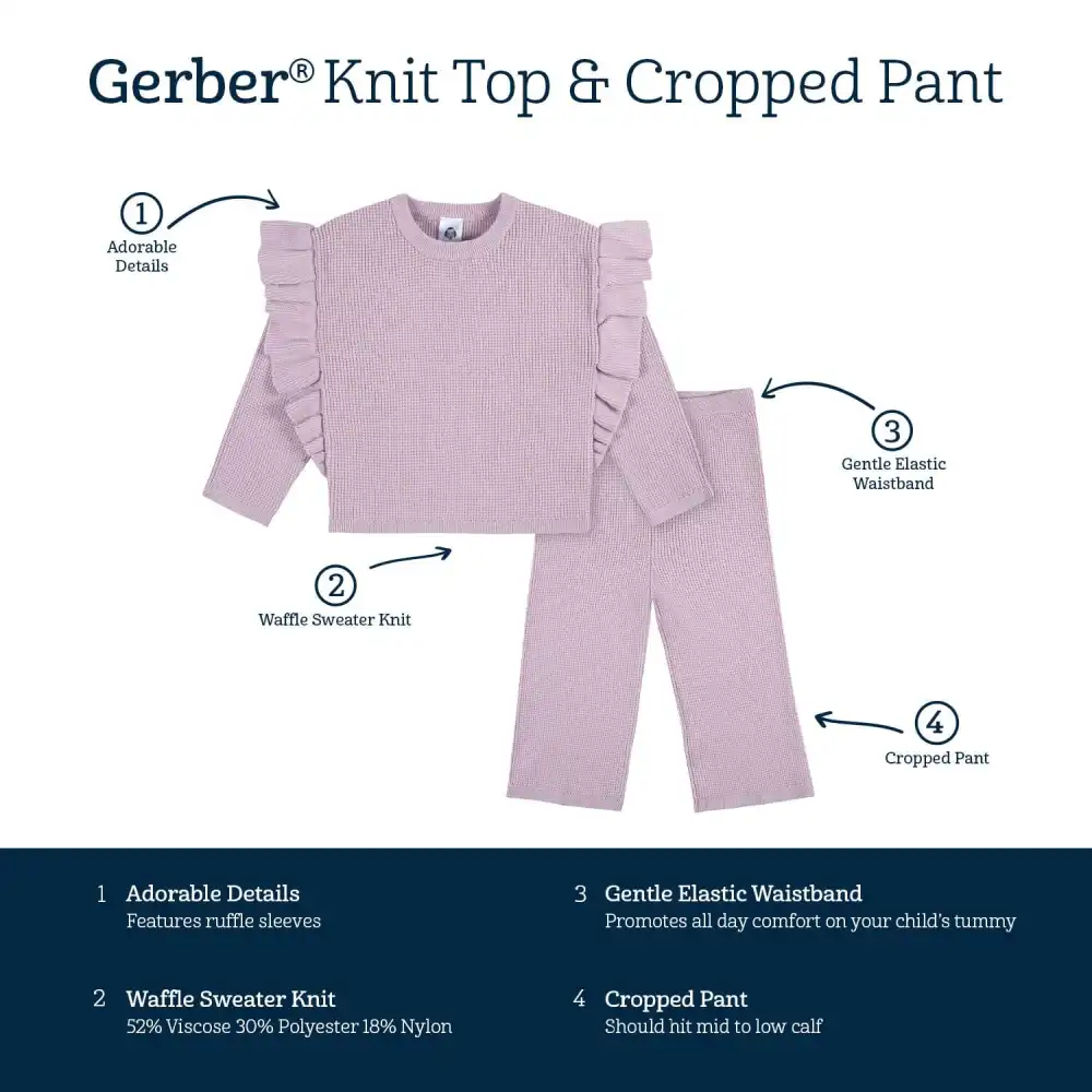 This matching lavender set for your little girl is made from a soft and cozy material to ensure all-day comfort. The set features a pullover top with a comfort-stretch rib finish at the neck and wrists, while the pullup bottom comes with a comfort-stretch waistband for a perfect fit. The relaxed fit design allows for ease of movement, while still fitting securely. This adorable set is perfect for everyday wear or family pictures. Shoulder ruffles extend down the length of top for an adorable touch. Our essentials have been independently certified with STANDARD 100 by OEKO-TEX® so that you don’t have to worry about harmful substances in your infant’s wardrobe. This set includes one top and one bottom.