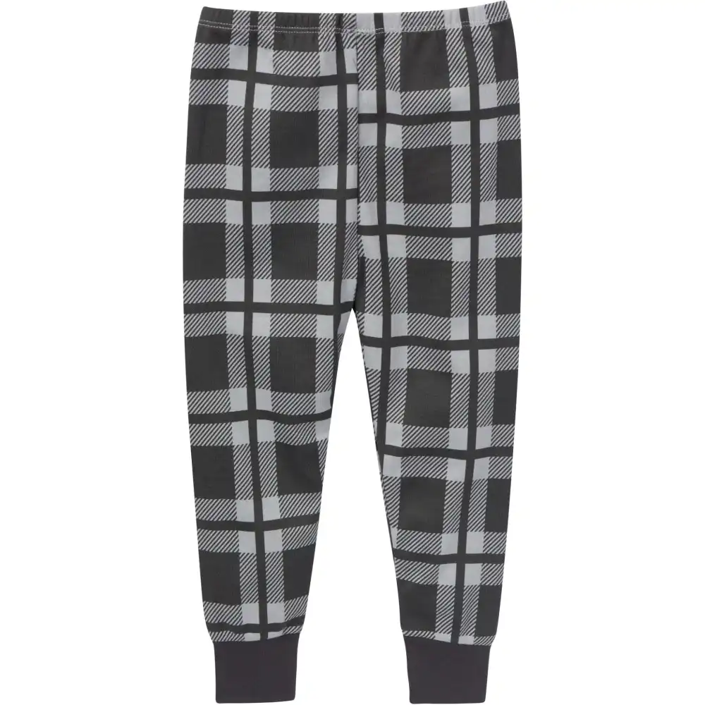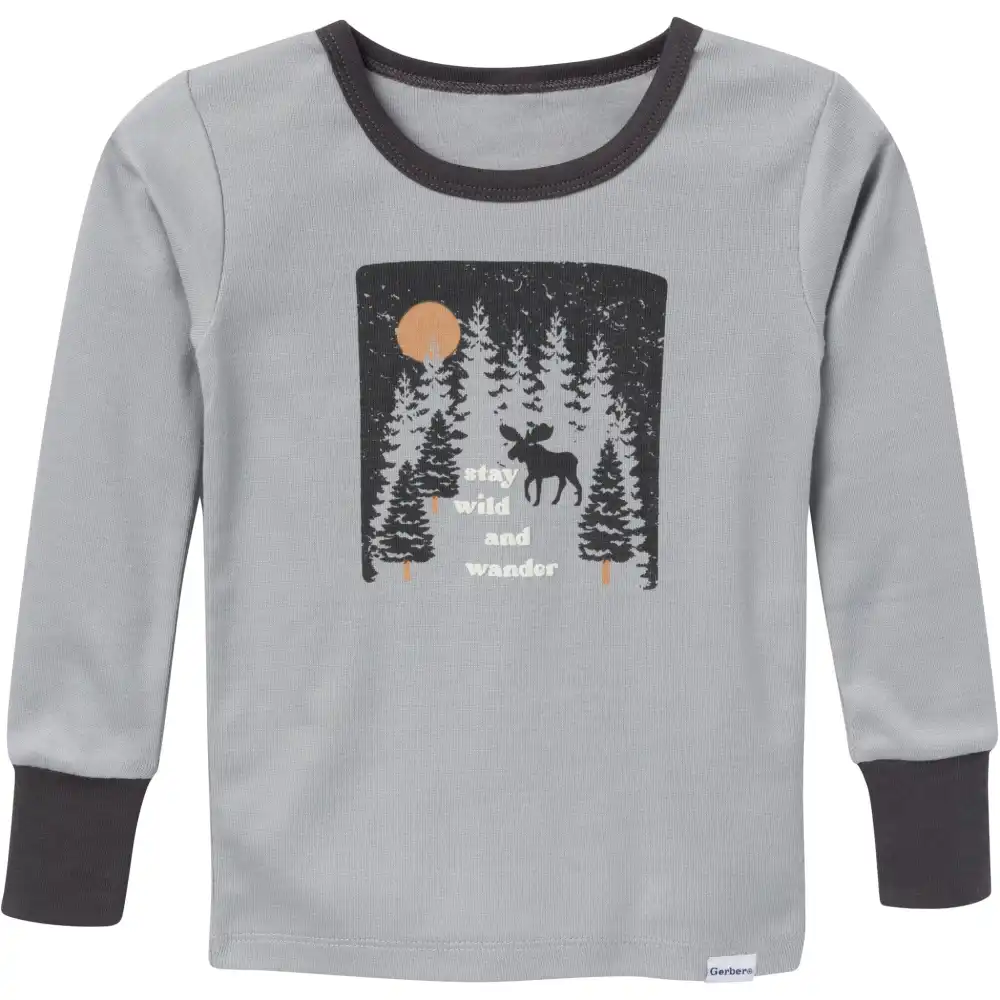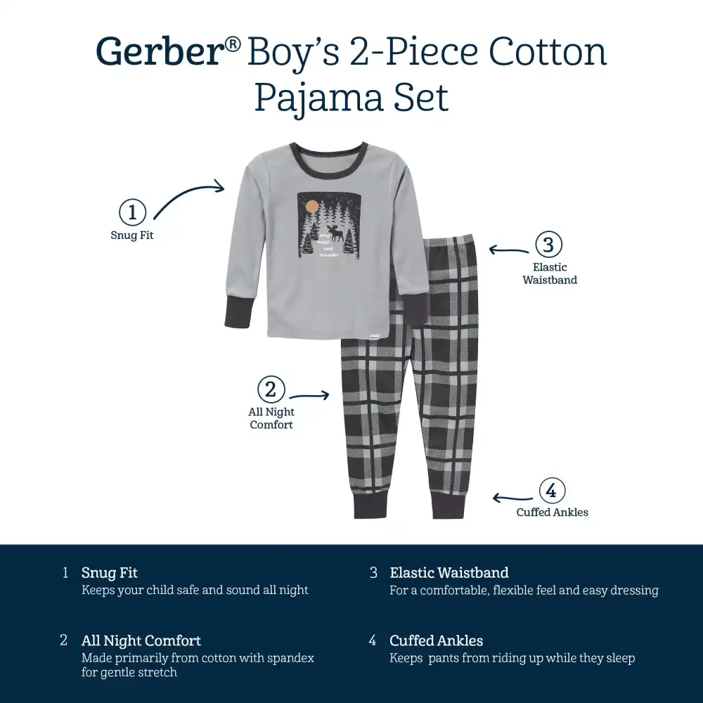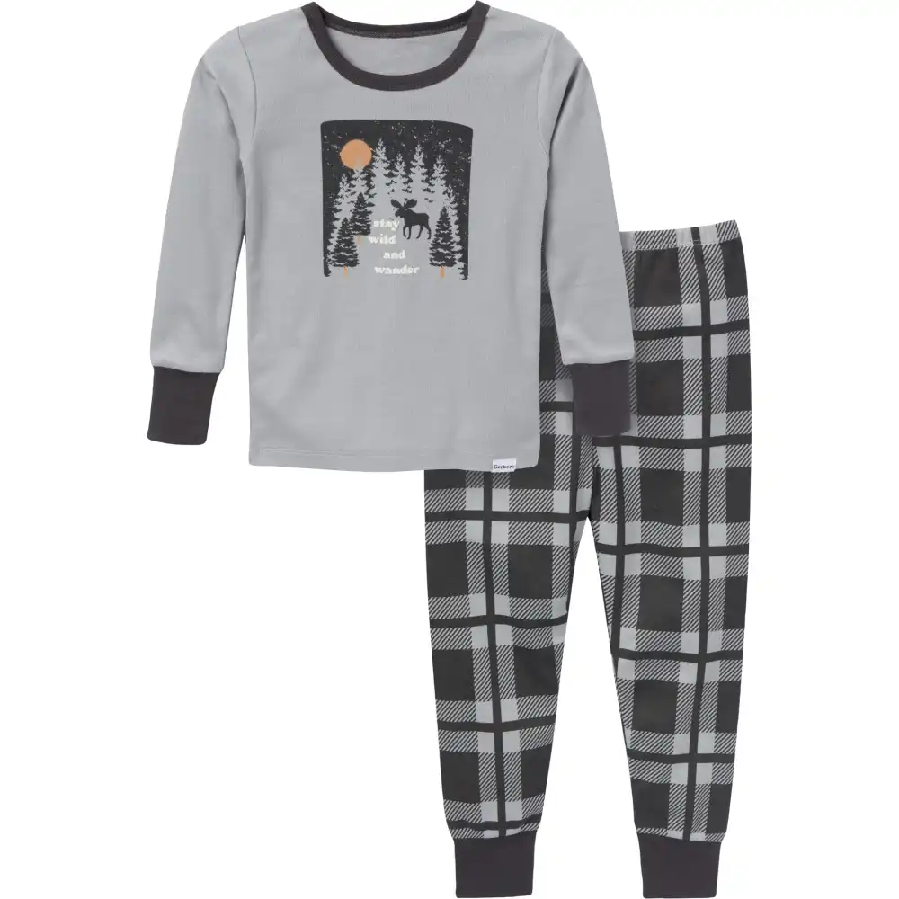 These 2-piece pajamas are just what your outdoors-loving baby or toddler needs after a long day of play. Featuring a charming outdoors theme with moose and evergreen tree print paired with matching gray plaid pants, these pajamas will bring the beauty of nature right to bedtime. Made primarily from soft cotton, they offer a breathable feel to keep him cozy and comfortable all night long. The spandex trim at the neckline, wrists, and ankles adds flexibility for easy movement, while the stretchy ribbing on the waistband ensures a secure, comfortable fit. Designed with a tight-fitting style for safe wear, these pajamas provide the ideal combination of comfort and security, making them a must-have for any adventurous little boy. Our essentials have been independently certified with STANDARD 100 by OEKO-TEX® so that you don’t have to worry about harmful substances in your baby’s wardrobe. ack includes matching pajama top and bottom.