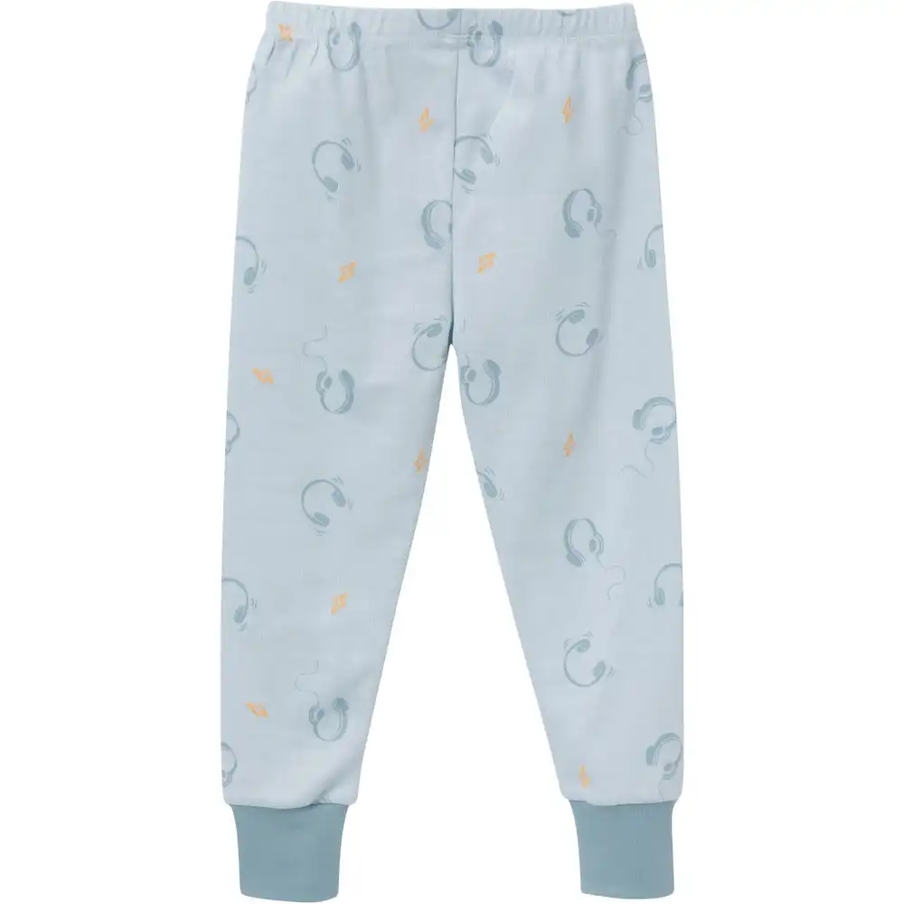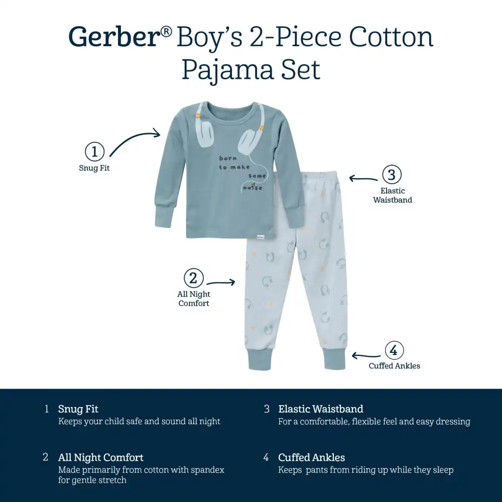 Perfect for little boys who love music, these 2-piece pajamas are sure to be a hit after a long day of play. Featuring a fun design with headphones and the playful text "born to make some noise" on the shirt, these pajamas celebrate his passion for rhythm and sound. Made primarily from soft cotton, they offer a breathable feel that keeps him cozy and comfortable throughout the night. The spandex trim at the neckline, wrists, and ankles provides flexibility for easy movement, while the stretchy ribbing on the waistband ensures a secure, comfortable fit. Designed with a tight-fitting style for safe wear, these pajamas are ideal for helping him wind down and get ready for a night of sweet dreams, making them a perfect choice for your little music lover. Our essentials have been independently certified with STANDARD 100 by OEKO-TEX® so that you don’t have to worry about harmful substances in your baby’s wardrobe. Pack includes matching pajama top and bottom.