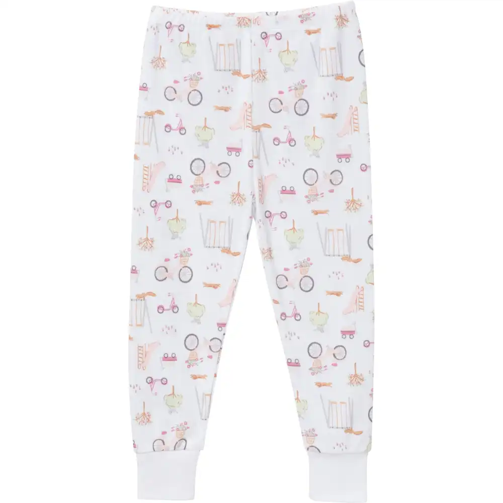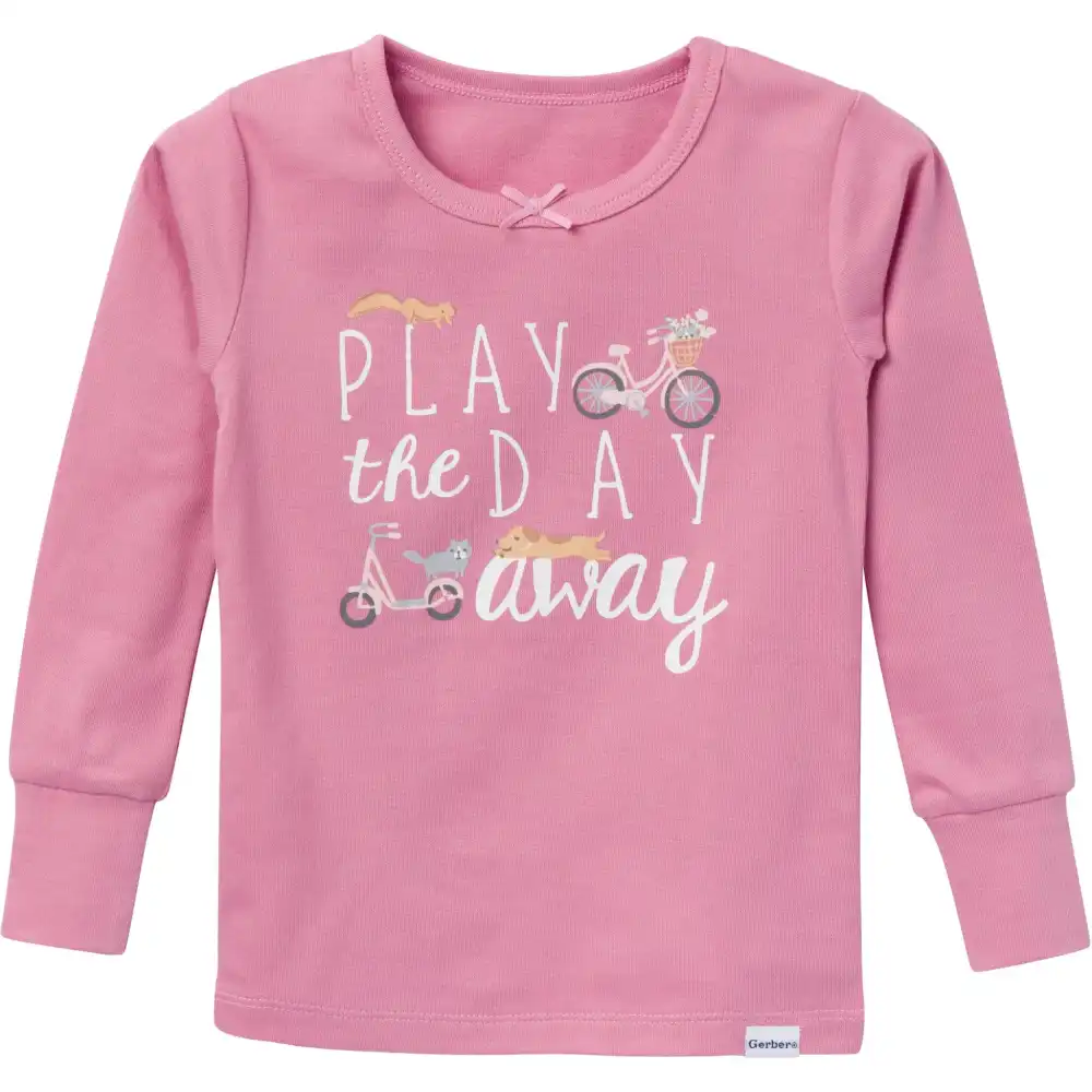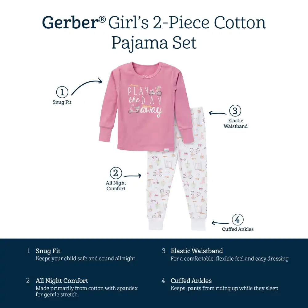 Adventurous little girls who are always on the move will love to get snug and cozy in these 2-piece pajamas after a fun-filled day of play. The soft pink shirt features the cheerful message "Play the day away," while the pants are decorated with playful prints of scooters, bikes, and playground scenes—perfectly designed for her love of play. Made primarily from soft cotton, these pajamas provide a breathable feel that keeps her cozy and comfortable all night long. The spandex trim at the neckline, wrists, and ankles ensures a flexible fit for easy movement, while the stretchy ribbing on the waistband offers a secure, comfortable hold. Made with a tight-fitting style for safe wear, these pajamas combine style, and safety for the bedtime comfort. Our essentials have been independently certified with STANDARD 100 by OEKO-TEX® so that you don’t have to worry about harmful substances in your baby’s wardrobe. Pack includes matching pajama top and bottom.
