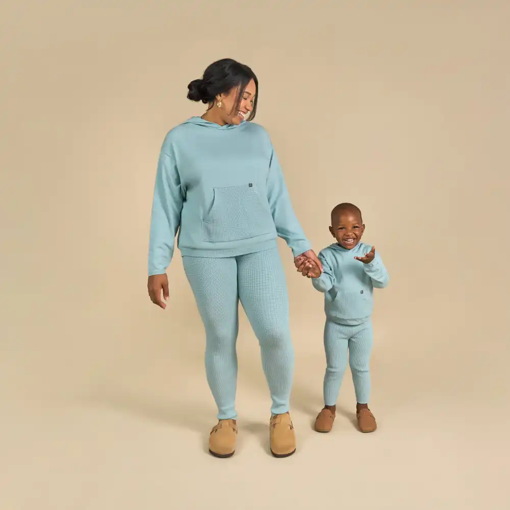 Dress your little one in style with our baby and toddler top and leggings set! Made from super soft viscose, this ensemble provides a gentle feel for all-day comfort. The slight stretch to the material allows for unrestricted movement, perfect for her active adventures. Crafted for warmth, this set keeps them cozy on cooler days while maintaining a cute look. Complete with a kangaroo pouch pocket for storing treasures or keeping tiny hands warm, this set is both practical and adorable. Plus, with a matching style to Mommy's outfit, you can both enjoy twinning for family pictures or everyday fun. Our essentials have been independently certified with STANDARD 100 by OEKO-TEX® so that you don’t have to worry about harmful substances in your little one’s wardrobe. Pack includes matching top and leggings.