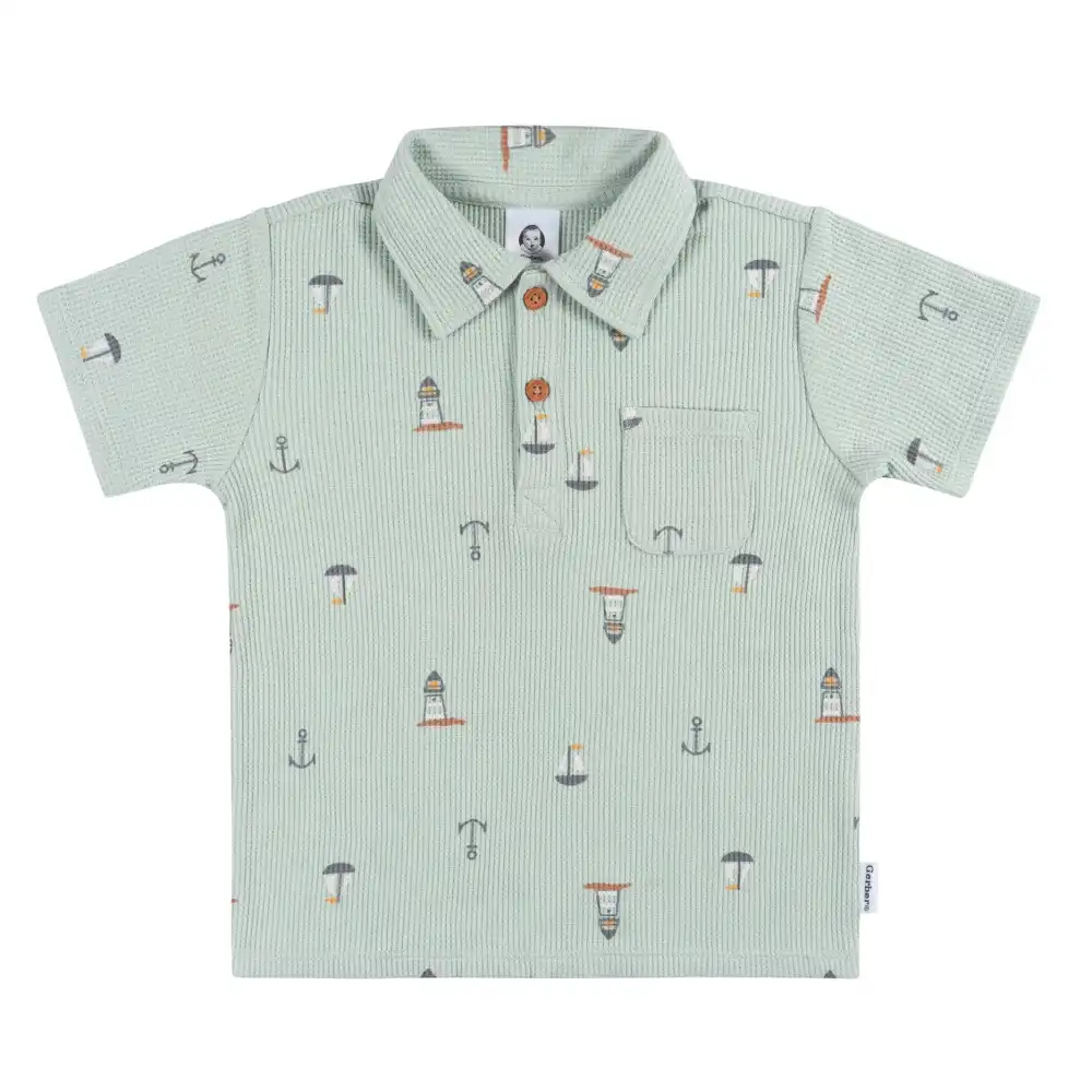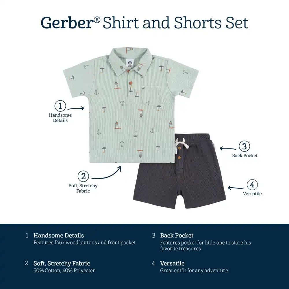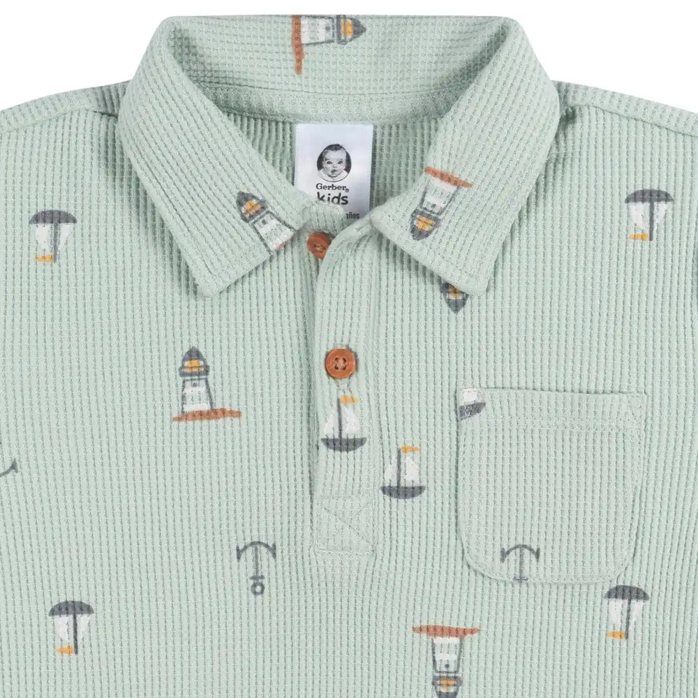 This collared shirt and shorts set is the perfect outfit for your toddler boy on sunny days! Made from a soft and stretchy material, it’s a comfy outfit he’ll love wearing all day long. From play dates to family outings, this toddler boy outfit is a great fit wherever the day takes you. Featuring stylish faux wood buttons and a cute sailboat print, he’ll look adorable and feel great all day long. Our essentials have been independently certified with STANDARD 100 by OEKO-TEX® so that you don’t have to worry about harmful substances in your toddler's wardrobe. Includes shirt and shorts set.
