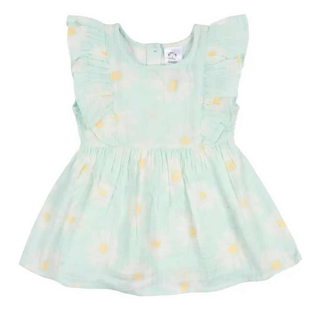 Gerber® baby and toddler girls ruffled, double layer gauze dresses are made of 100% cotton fabric that’s cool, comfy, and gentle on sensitive skin. Our essentials have been independently certified with STANDARD 100 by OEKO-TEX® so that you don’t have to worry about harmful substances in your little one’s wardrobe. This set includes one sleeveless ruffle dress and one diaper cover in daisy print.
