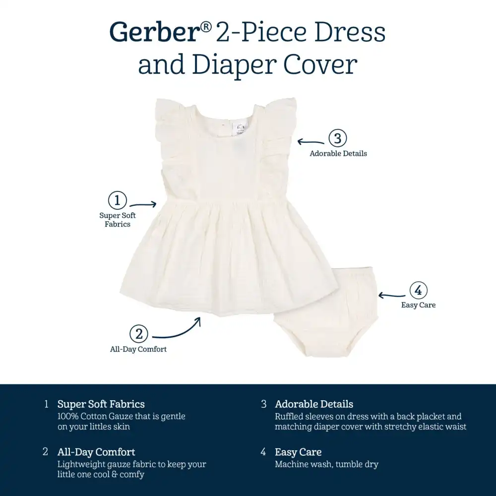 Gerber® baby and toddler girls ruffled, double layer gauze dresses are made of 100% cotton fabric that’s cool, comfy, and gentle on sensitive skin. Our essentials have been independently certified with STANDARD 100 by OEKO-TEX® so that you don’t have to worry about harmful substances in your little one’s wardrobe. This set includes one sleeveless ruffle dress and one diaper cover in solid ivory.