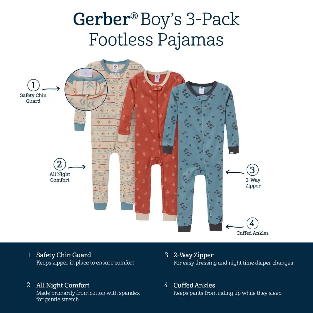 These soft pajamas are a wonderful choice for winding down after a day full of play and adventure. Made primarily from soft cotton, they offer a breathable feel that ensures your little one stays cozy and comfortable through the night. The 3-pack includes Western-themed designs featuring cactuses, buffalo and a classic traditional pattern. Each pajama is designed with a two-way zipper and neckline guard for easy dressing and quick diaper changes, while spandex trim at the neckline and wrists provides a flexible, secure fit. With a tight-fitting style for safe wear, these pajamas combine comfort and whimsical style, making bedtime as delightful as the day's adventures. Our essentials have been independently certified with STANDARD 100 by OEKO-TEX® so that you don’t have to worry about harmful substances in your baby’s wardrobe. Pack includes three snug fitting footless pajamas.