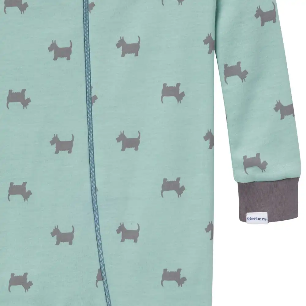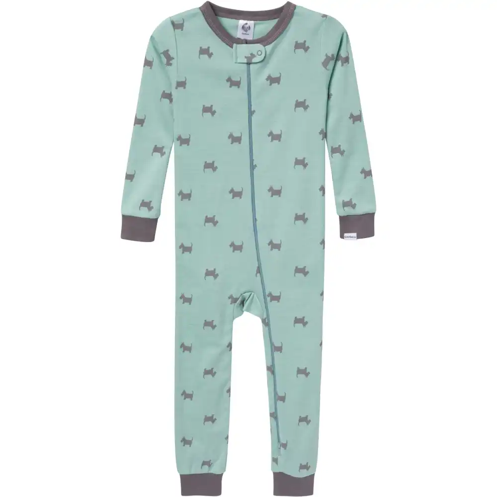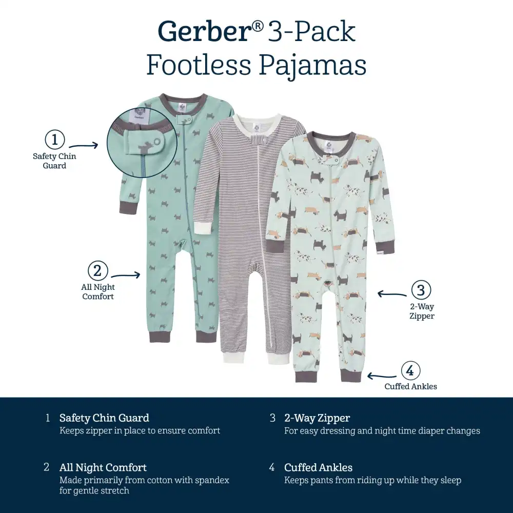 After a day full of fun and play, these 3-pack pajamas provide a variety of choices for your baby or toddler to get cozy for pleasant dreams. Made primarily from soft cotton, they offer a breathable feel that keeps your little one snug and relaxed all night. Featuring a playful dog theme, each pajama celebrates your child's love for furry friends with a different print. The pajamas are designed with a two-way zipper and neckline guard for easy dressing and quick diaper changes, while spandex trim at the neckline and wrists ensures a flexible, secure fit. With a tight-fitting style for added safety, these pajamas combine warmth and charm, making bedtime both comfortable and enjoyable. Our essentials have been independently certified with STANDARD 100 by OEKO-TEX® so that you don’t have to worry about harmful substances in your baby’s wardrobe. Pack includes three snug fitting footless pajamas.