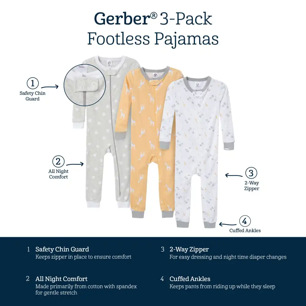 These 3-pack of pajamas provides a variety of designs your baby or toddler will love. After a day full of exploration and fun, they'll enjoy picking a favorite to settle into cozy sleep with. Made primarily from soft cotton, they provide a breathable feel that ensures comfort throughout the night. Each pair is designed with a two-way zipper and neckline guard for effortless dressing and quick diaper changes, while spandex trim at the neckline and wrists offers a flexible, secure fit. With a tight-fitting style for safety, these pajamas combine warmth with a touch of adventure, making bedtime as snug and exciting as their daytime escapades. Our essentials have been independently certified with STANDARD 100 by OEKO-TEX® so that you don’t have to worry about harmful substances in your baby’s wardrobe. Pack includes three snug fitting footless pajamas.