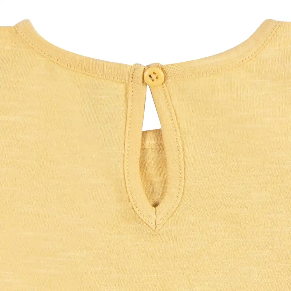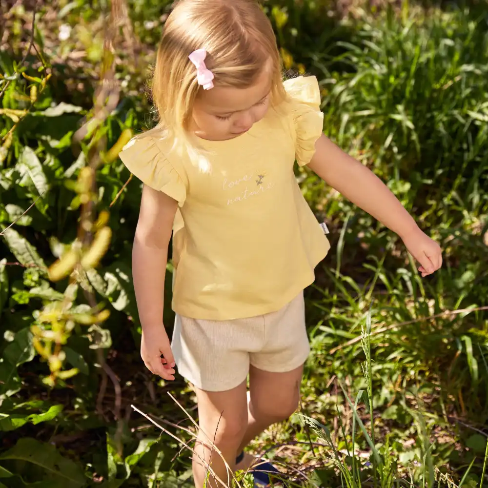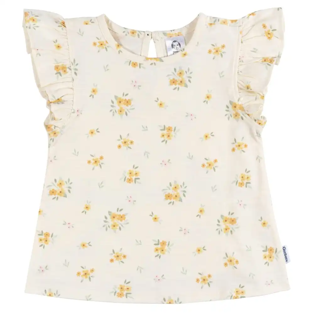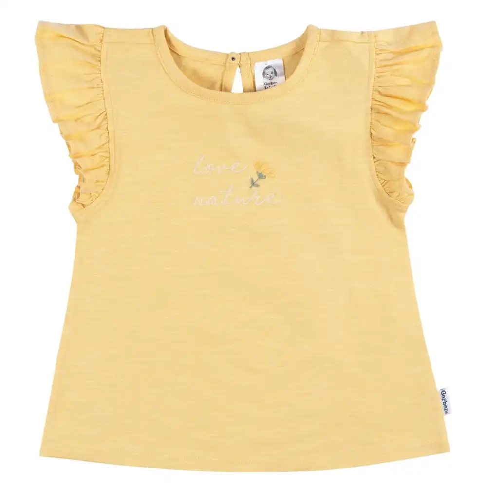 Embrace the sunshine with a wardrobe refresh! This set of three T-shirts for baby girls or toddler girls elevates their warm-weather style. Crafted from 100% cotton, the shirts are gentle on delicate skin and offer a breathable fit. With an assortment of prints and colors in the bundle, it's effortless to create coordinated outfits that your little one will enjoy wearing wherever the day takes you. The addition of shoulder ruffles adds a trendy flair to this comfortable daily choice. For stress-free care, these T-shirts are all machine washable so can have them clean and ready to wear all season long. Our essentials have been independently certified with STANDARD 100 by OEKO-TEX® so that you don’t have to worry about harmful substances in your little one’s wardrobe. Includes three T-shirts.
