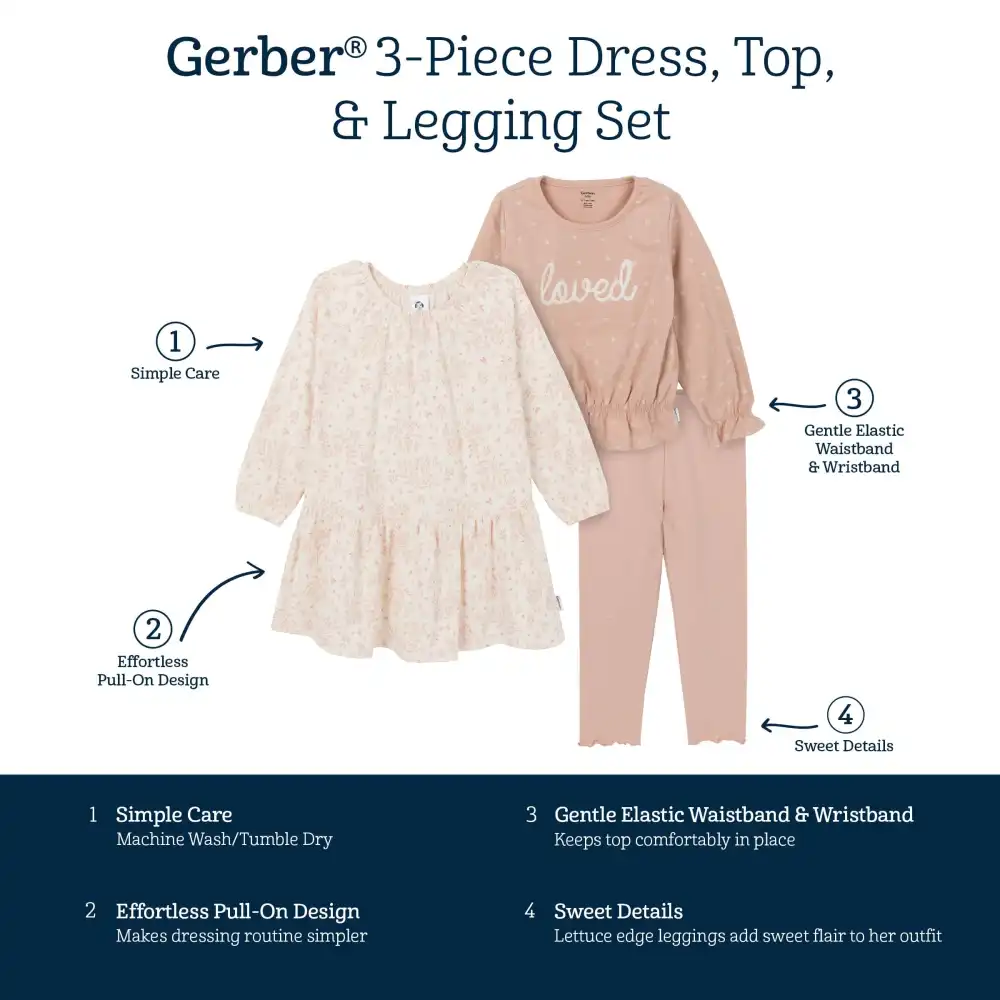 Get her ready for the fall and cooler months with our stylish toddler girl three-piece outfit set, designed to keep her warm and comfy throughout the day. Crafted primarily from thick, cozy cotton, this ensemble guarantees comfort and warmth wherever she goes. With strategic elastic at the neck and sleeves of the dress, as well as at the sleeves of the shirt and the waistband of the pants, she’ll have flexibility and ease of movement. Charming lettuce edge detailing at the pant ankles adds a delightful touch of flair to the outfit. Perfect for layering and outdoor play, this set combines practicality with style, making it an essential addition to her fall wardrobe. Our essentials have been independently certified with STANDARD 100 by OEKO-TEX® so that you don’t have to worry about harmful substances in your baby’s wardrobe. This pack includes one dress and one shirt with matching pants.