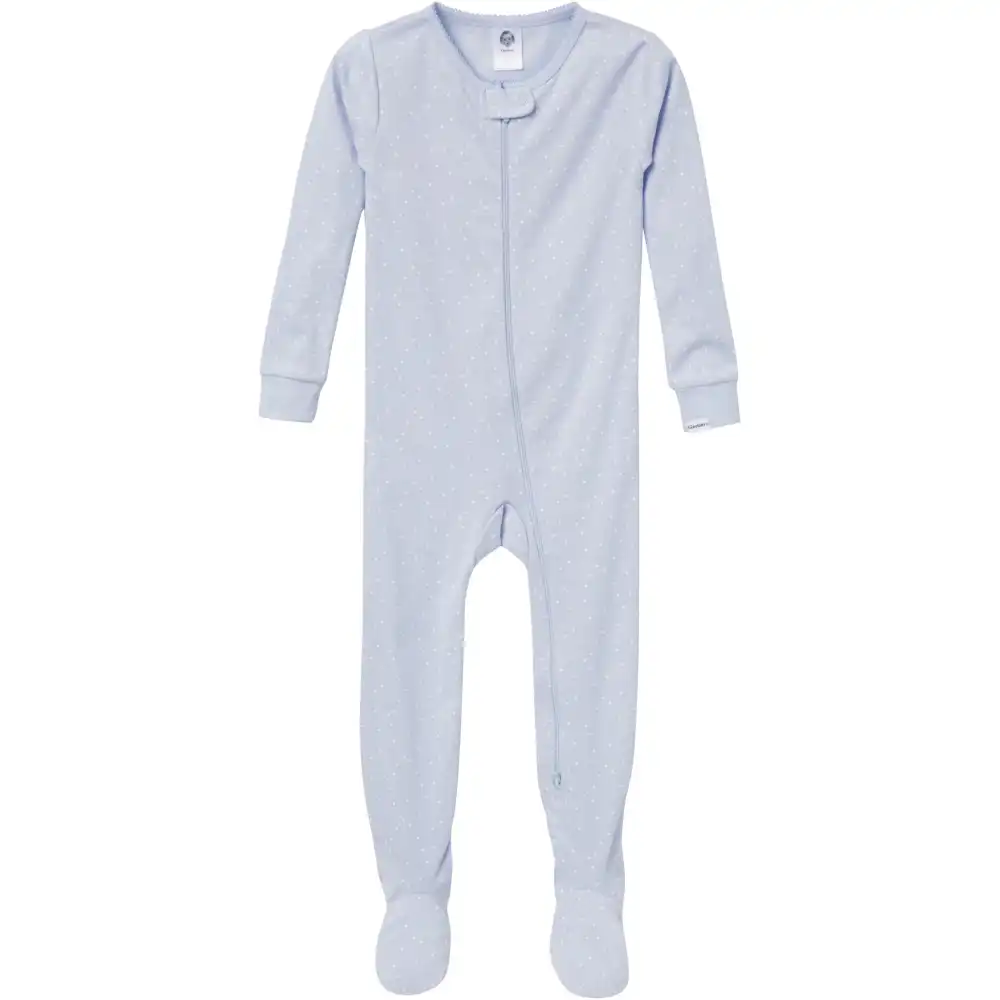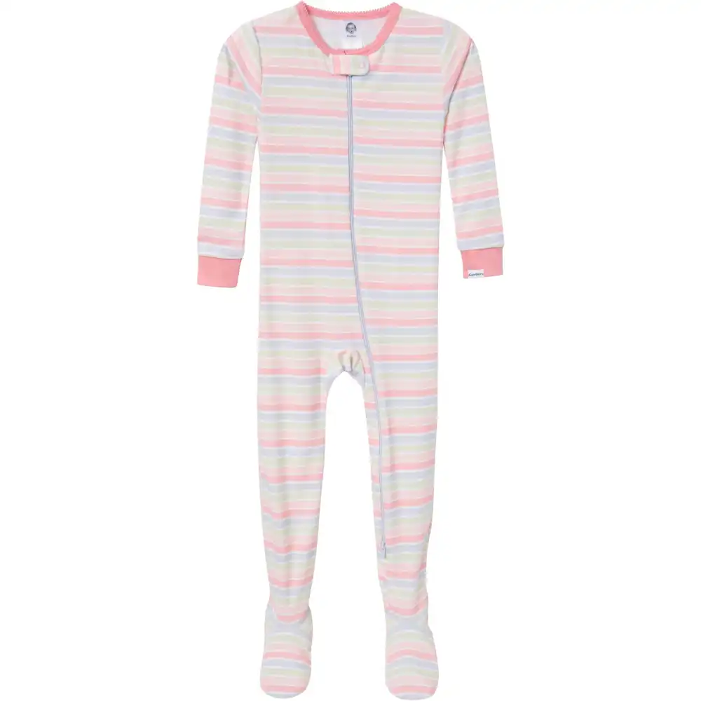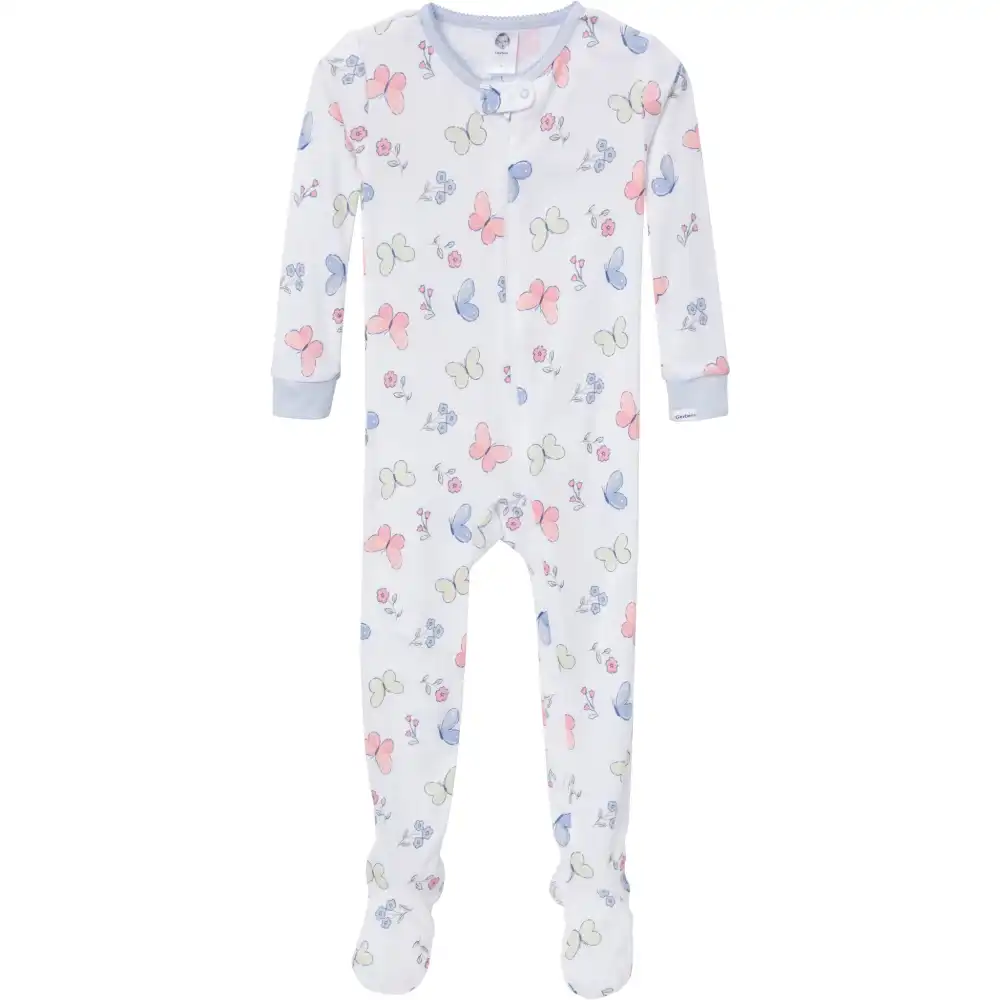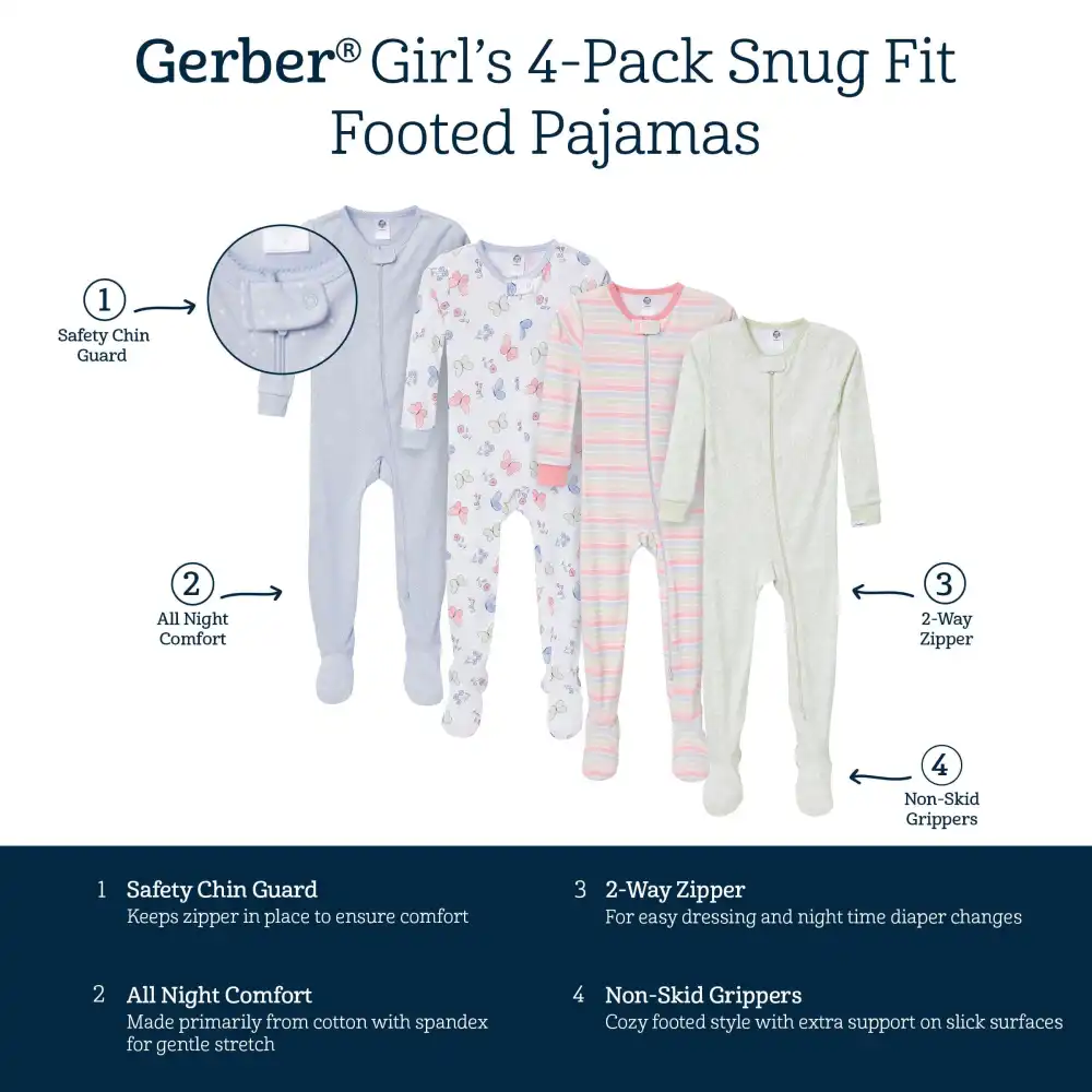 Prepare your little one for colder nights with this adorable 4-pack of baby girl or toddler girl pajamas, designed to keep her cozy and comfy all season long. Made primarily from soft cotton, these pajamas provide a gentle, breathable feel that’s perfect for sensitive skin. A two-way zipper with a neckline guard allows for easy dressing and diaper changes, while spandex trim at the neckline and wrists offers a flexible, secure fit. The tight-fitting style ensures safe sleep, and non-skid soles provide extra traction and support for little walkers. Featuring charming butterfly prints and pastel color themes, this pajama pack makes a thoughtful baby shower gift that combines style, comfort, and practicality. Our essentials have been independently certified with STANDARD 100 by OEKO-TEX® so that you don’t have to worry about harmful substances in your baby’s wardrobe. Pack includes 4 snug-fitting footed pajamas.