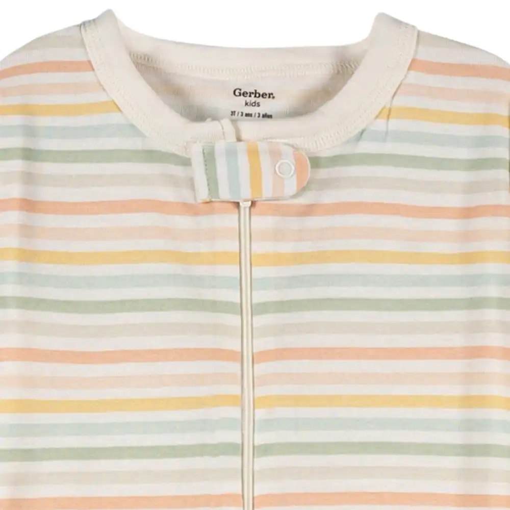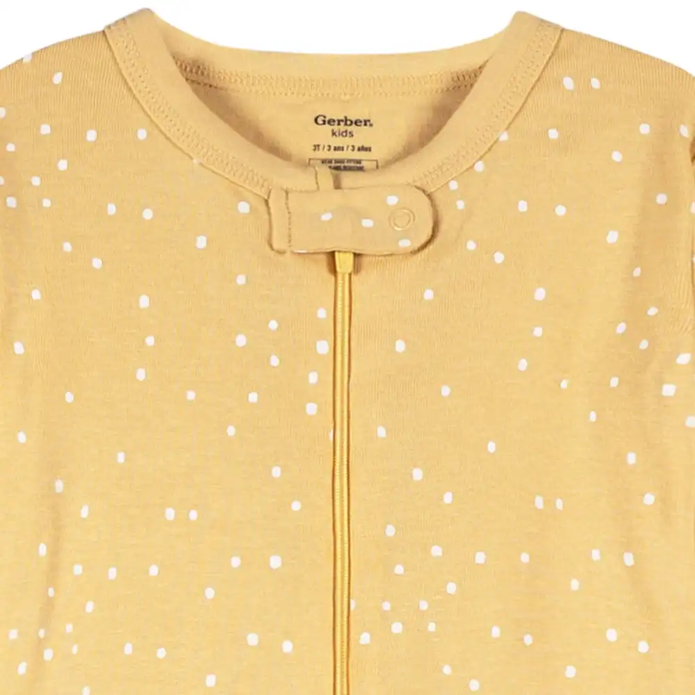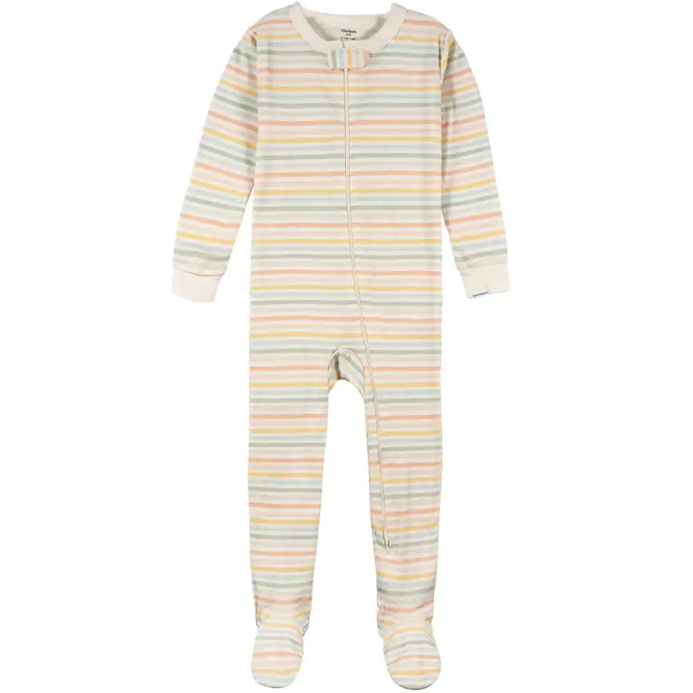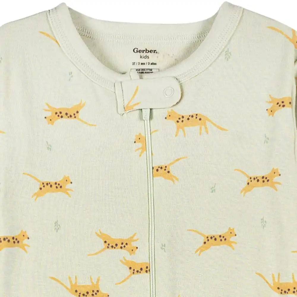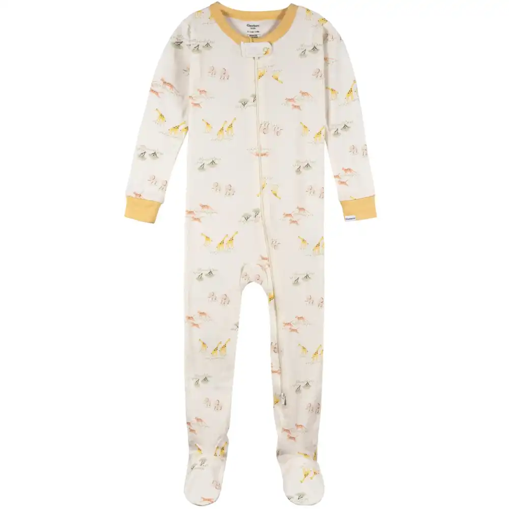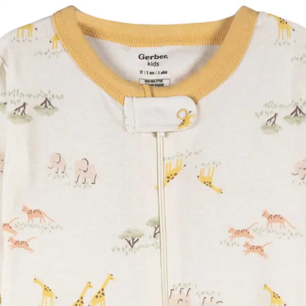 Prepare your little one for chilly nights with this delightful 4-pack of baby or toddler pajamas, perfect for cozying up when the weather turns colder. Crafted primarily from soft cotton, these pajamas offer a gentle, breathable feel that’s ideal keeping warm without overheating. Featuring a two-way zipper with a neckline guard, our pajamas make dressing and diaper changes easy. The spandex trim at the neckline and wrists provides a flexible, secure fit, while the snug-fitting design ensures safe sleep. Non-skid soles offer extra traction for those first steps or playful adventures. With a charming safari animal print and color theme, this multi-pack makes a thoughtful baby shower gift, combining comfort, practicality, and fun all in one. Our essentials have been independently certified with STANDARD 100 by OEKO-TEX® so that you don’t have to worry about harmful substances in your baby’s wardrobe. Pack includes 4 snug-fitting footed pajamas.