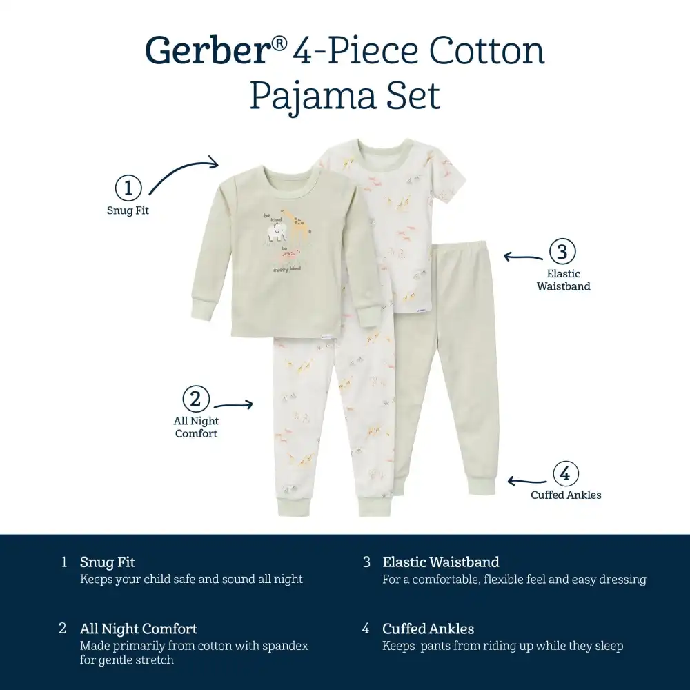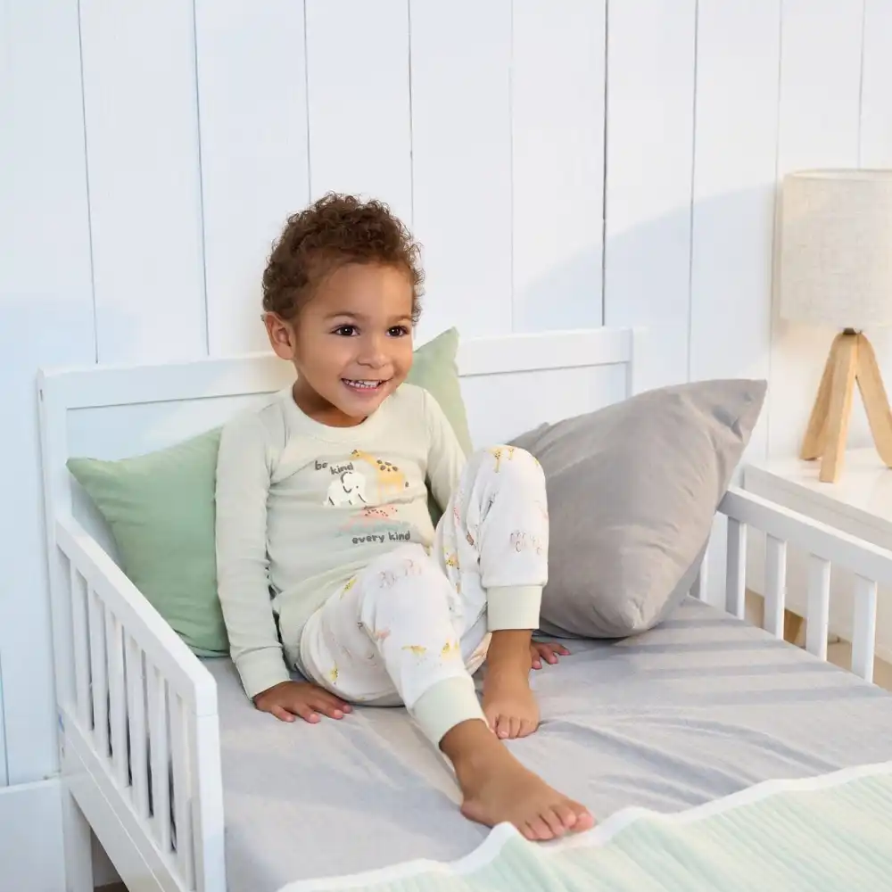 Make bedtime an exciting adventure with our safari themed 4-piece pajama sets. Made primarily from soft cotton, they offer a breathable feel that keeps your baby or toddler cozy all night long. The pajamas feature spandex trim at the neckline, wrists, and ankles for a flexible, snug fit, while the comfort-stretch waistband ensures easy wear and keeps the pajamas securely in place. Designed with a tight-fitting style for safety, each set includes a short sleeve version, and a long sleeve version adorned with playful safari theme designs. Ideal for winding down after a busy day, they can drift of dreams of their next big adventure. Our essentials have been independently certified with STANDARD 100 by OEKO-TEX® so that you don’t have to worry about harmful substances in your baby’s wardrobe. Pack includes two pajamas tops with two matching bottoms.