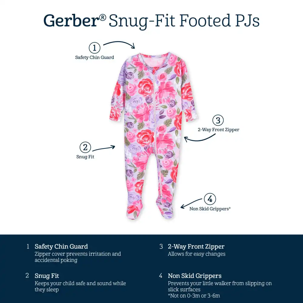 Designed for every season, our buttery soft collection of affordable rompers, sleepwear, Dresses and headbands will be their new wardrobe favs! We've partnered with Livaeco™ by Birla Cellulose to bring you and your little ones a more sustainably produced, environmentally-friendly viscose fiber collection made predominately from eucalyptus blended with spandex. This extremely soft lilac floral print footed pajama is super comfy and designed for long wear. Features a double zipper to make changes super easy. High-quality, lightweight, breathable, durable fabric with the perfect amount of stretch for active babies and toddlers. Prints and solids made for sibling matching. A bedtime favorite for sure. Gerber® quality, comfort, safety and value never goes out of style!