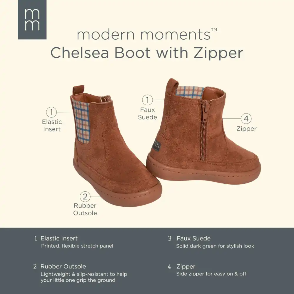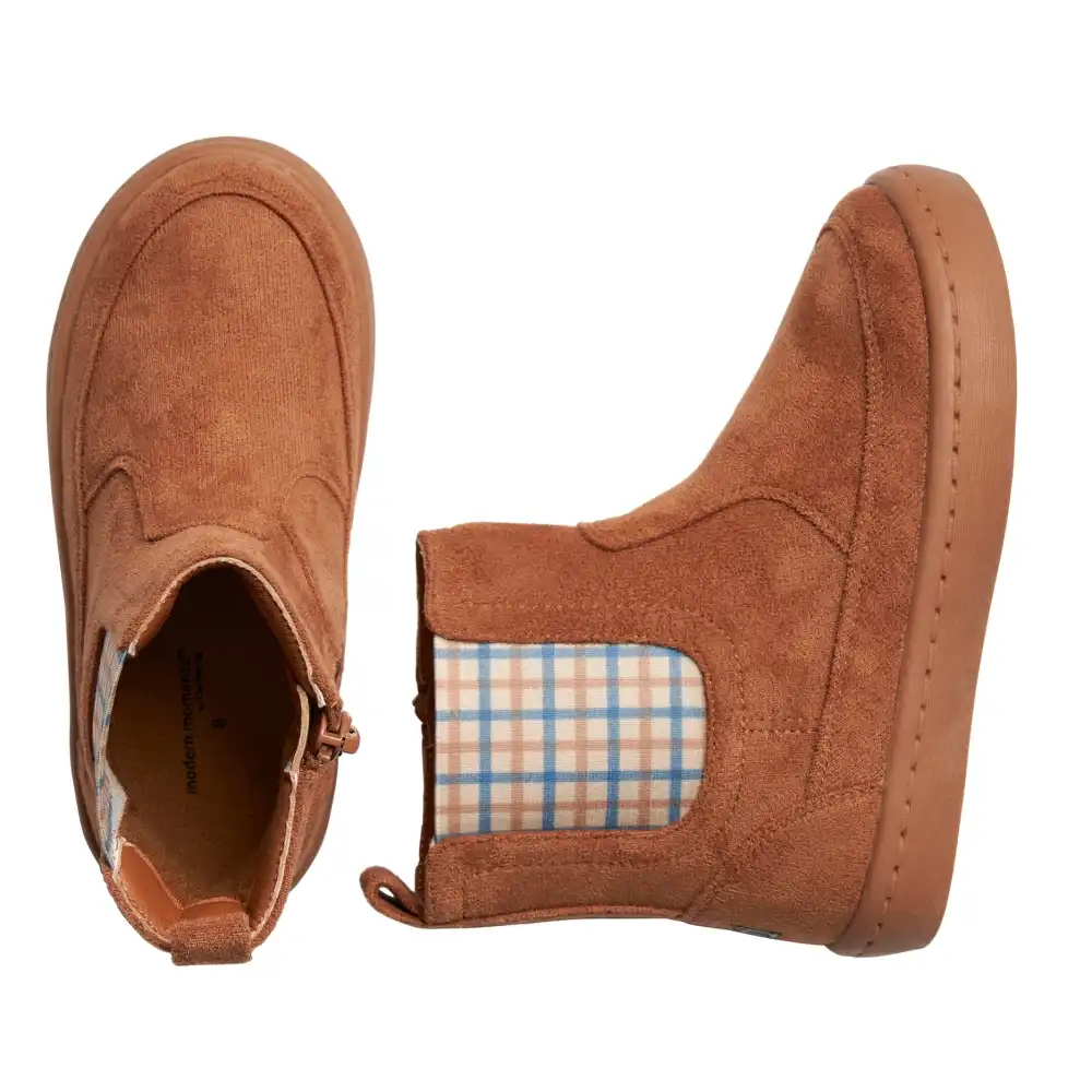 Elevate his footwear game with our trendy Chelsea boot, crafted with the perfect blend of style and durability. The soft interior jersey lining provides a gentle feel, making these boots a go-to choice for all-day comfort. Built to last, the durable rubber sole provides traction and support, ensuring confident strides wherever your little one goes. Thanks to the side zip, slipping into these boots is a breeze, while the heel loop adds an extra touch of convenience. And with a printed elastic insert, these boots make a statement with every step. Pack includes one pair of Chelsea boots.