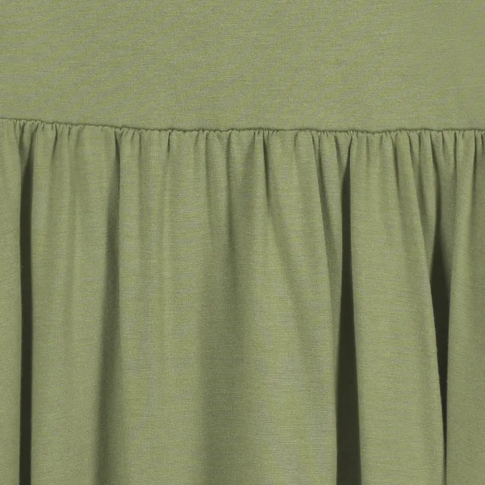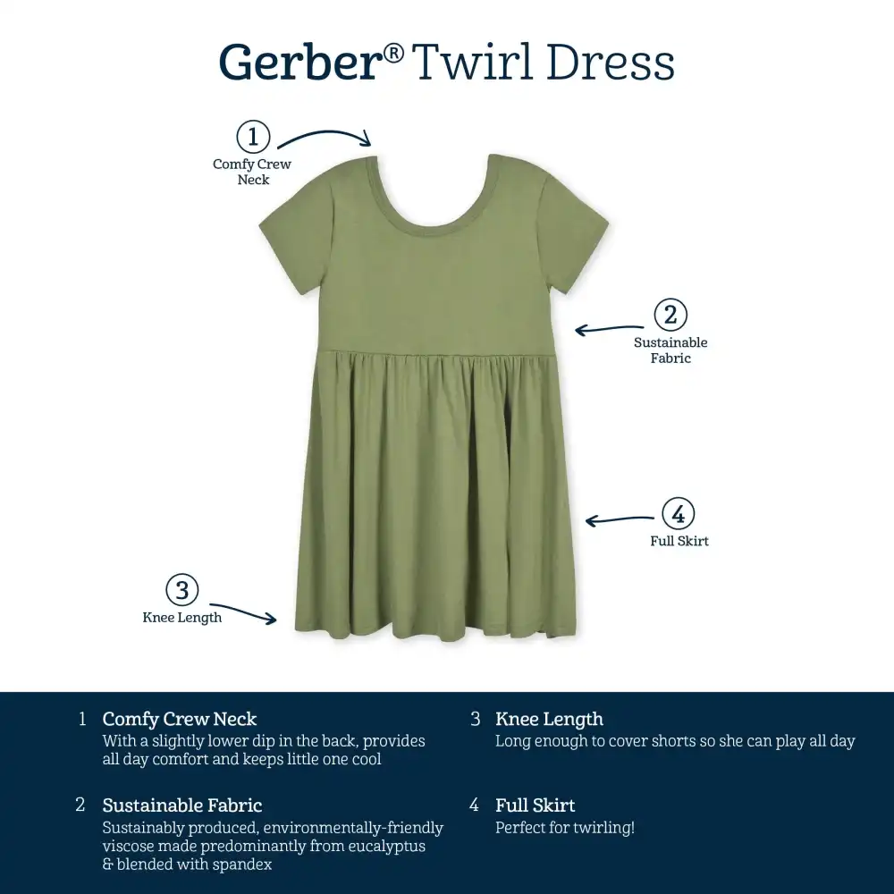 Designed for every season, our buttery soft collection of affordable rompers, sleepwear, Dresses and headbands will be their new wardrobe faves! We've partnered with Livaeco™ by Birla Cellulose to bring you and your little ones a more sustainably produced, environmentally-friendly viscose fiber collection made predominately from eucalyptus blended with spandex. This extremely soft solid mos / olive green Dress is made for twirling. The perfect look for any occasion. High-quality, lightweight, breathable, durable fabric with the perfect amount of stretch for active babies and toddlers. Prints and solids made for sibling matching. This short sleeve twirl Dress is comfy fitting for all day wear. Gerber® quality, comfort, safety and value never goes out of style!