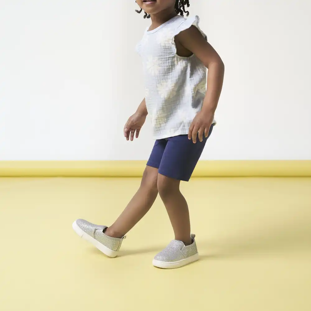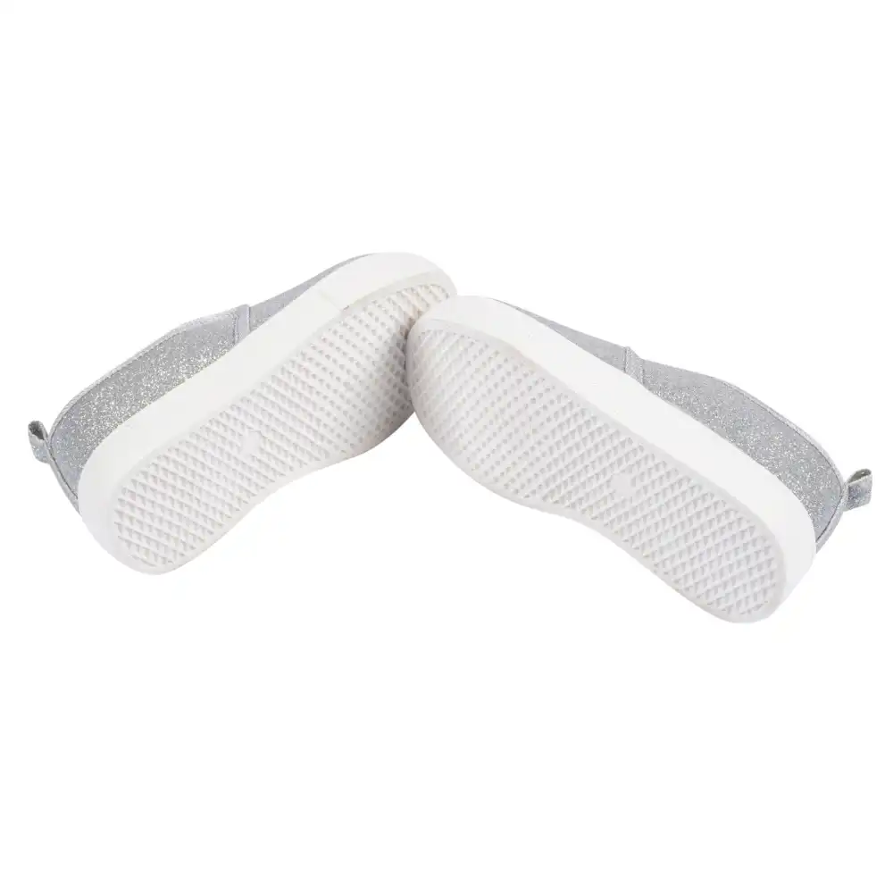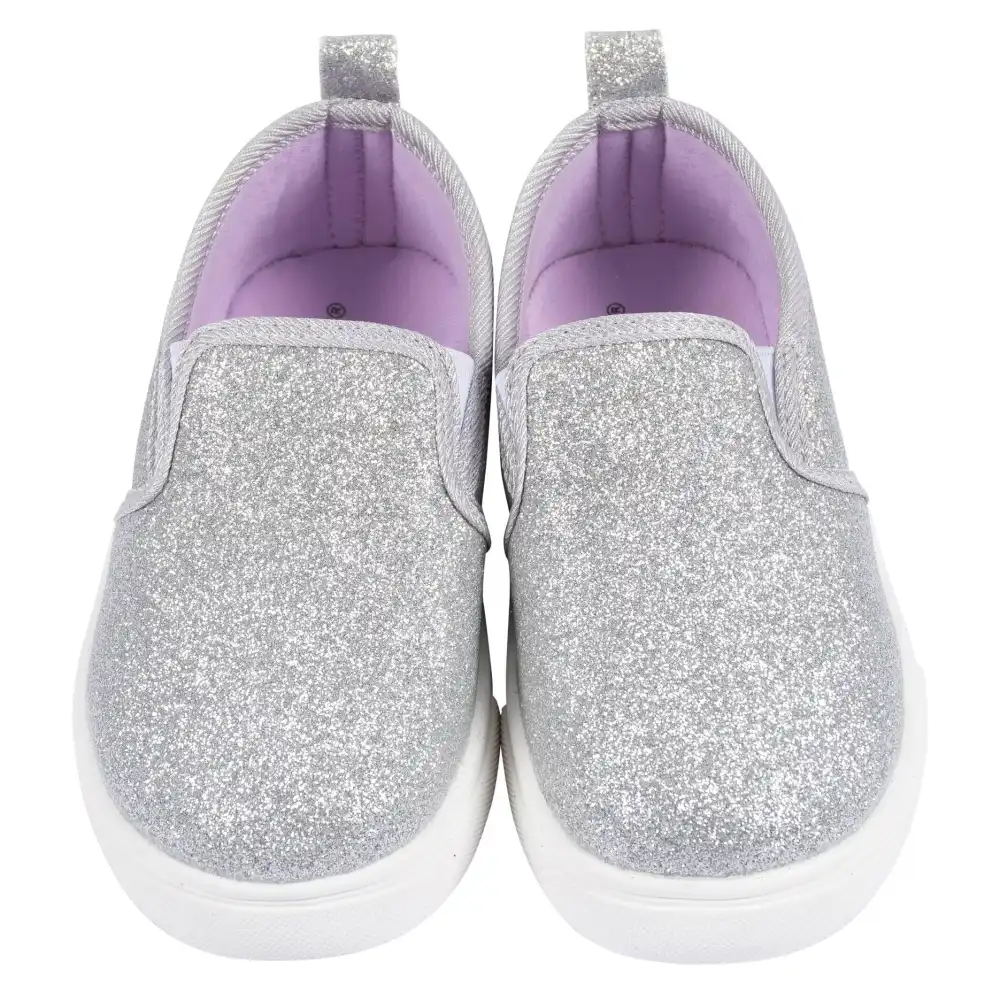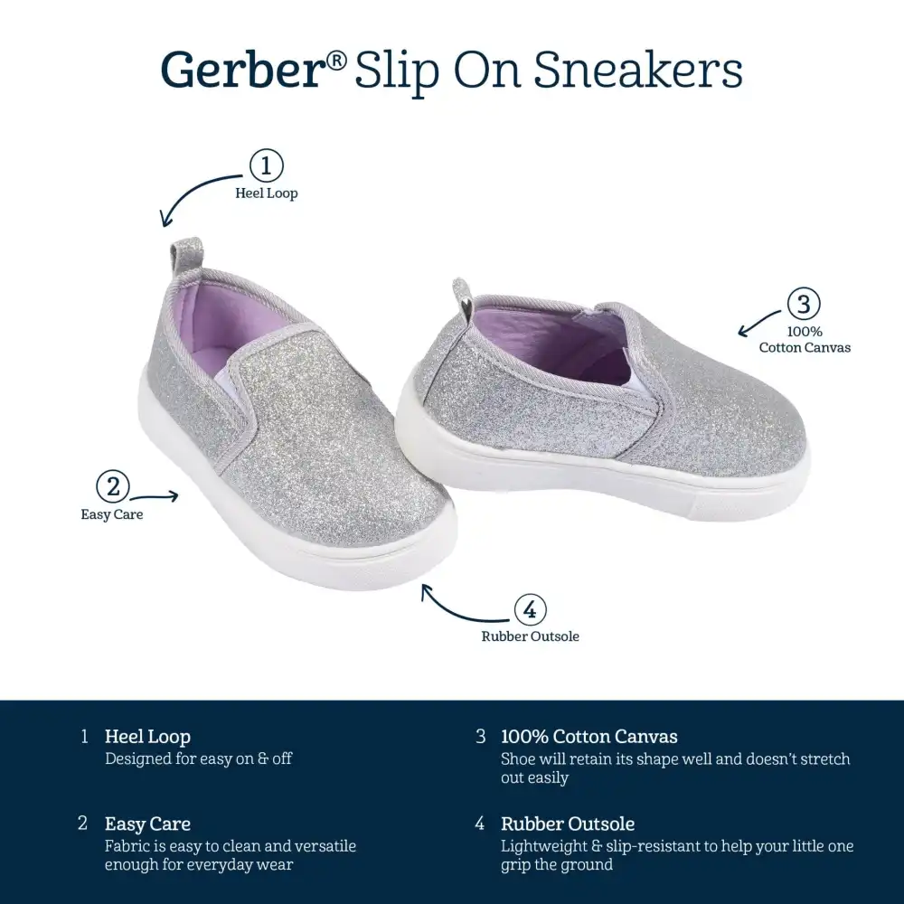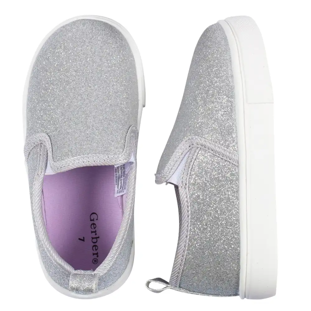 When it's time to dress up a little, this toddler girl shoe is the perfect fit! Made from 100% cotton canvas with a soft poly jersey lining and featuring a no-skid sole, your little one will be comfortable and secure. Pack includes one pair of silver glitter slip-on shoes.