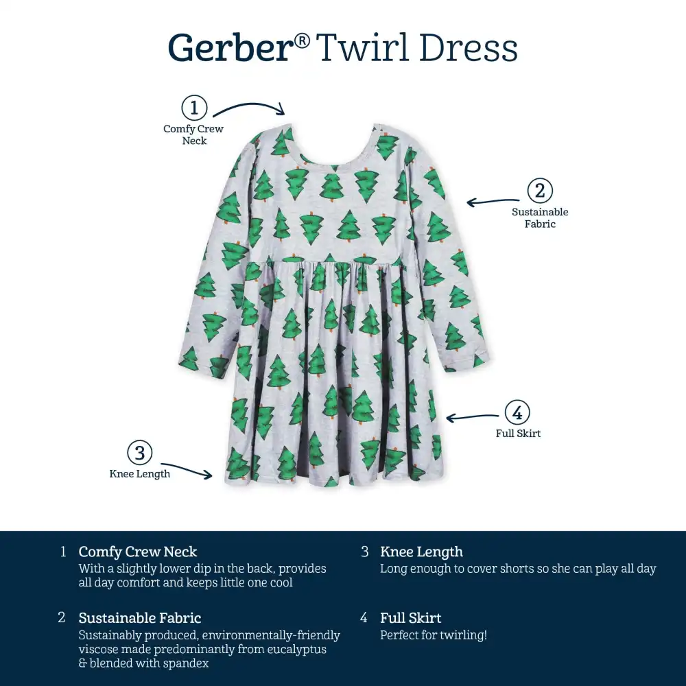 Designed for every season, our buttery soft collection of affordable rompers, sleepwear, Dresses and headbands will be their new wardrobe faves! We've partnered with Livaeco™ by Birla Cellulose to bring you and your little ones a more sustainably produced, environmentally-friendly viscose fiber collection made predominately from eucalyptus blended with spandex. This extremely soft spruce pine holiday print Dress is made for twirling. The perfect look for any occasion. High-quality, lightweight, breathable, durable fabric with the perfect amount of stretch for active babies and toddlers. This long sleeve twirl Dress is comfy fitting for all day wear. Gerber® quality, comfort, safety and value never goes out of style!