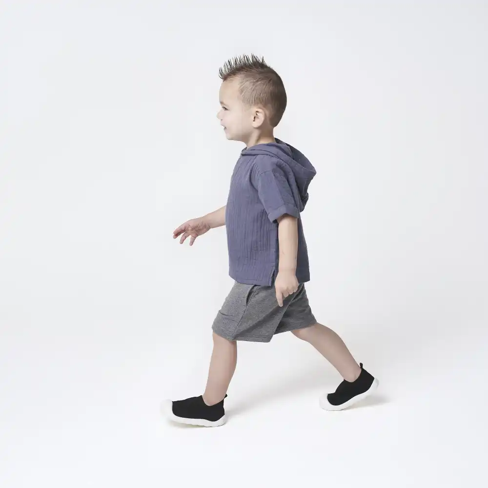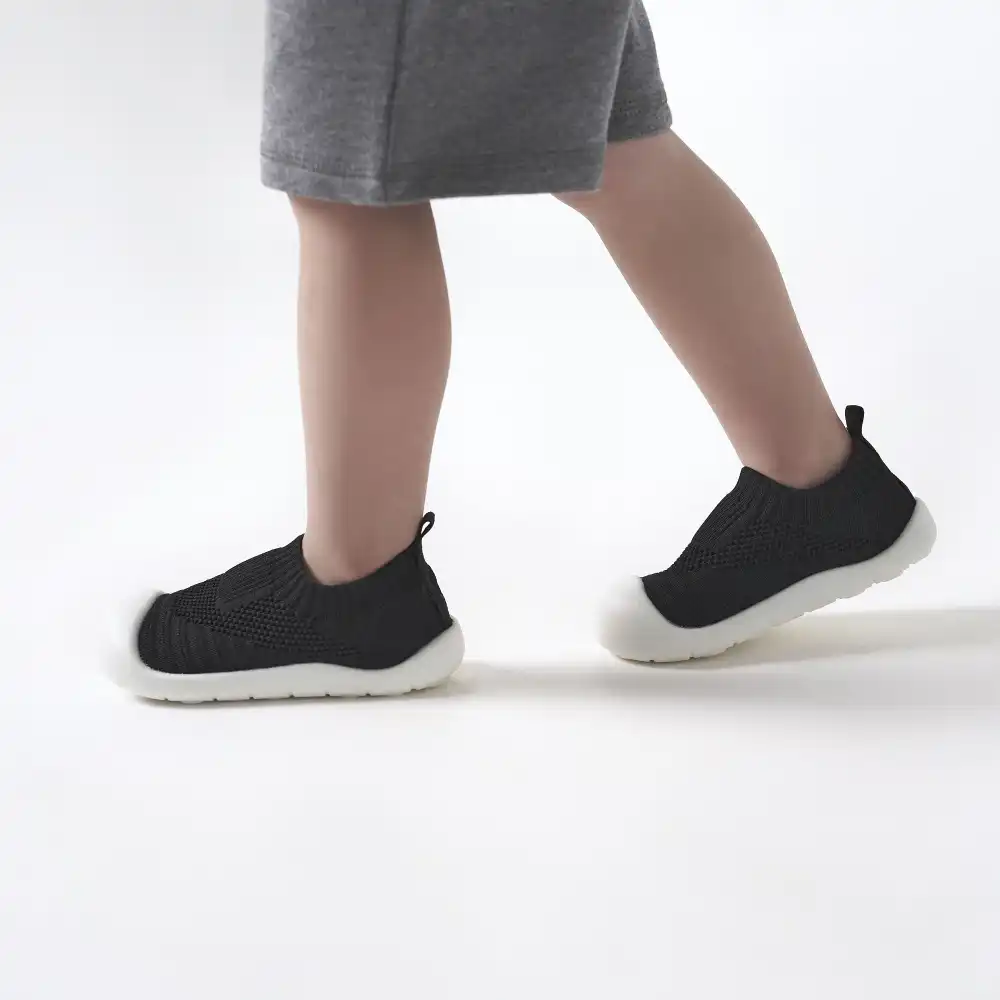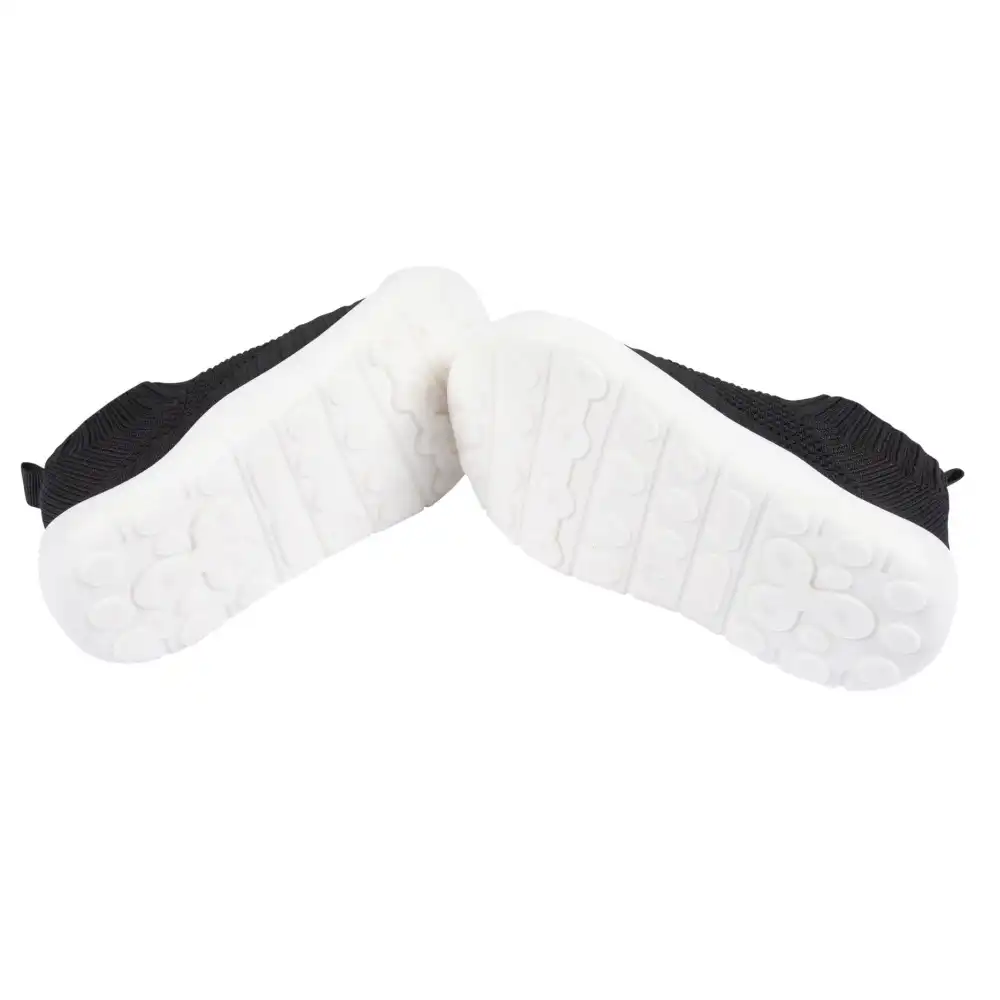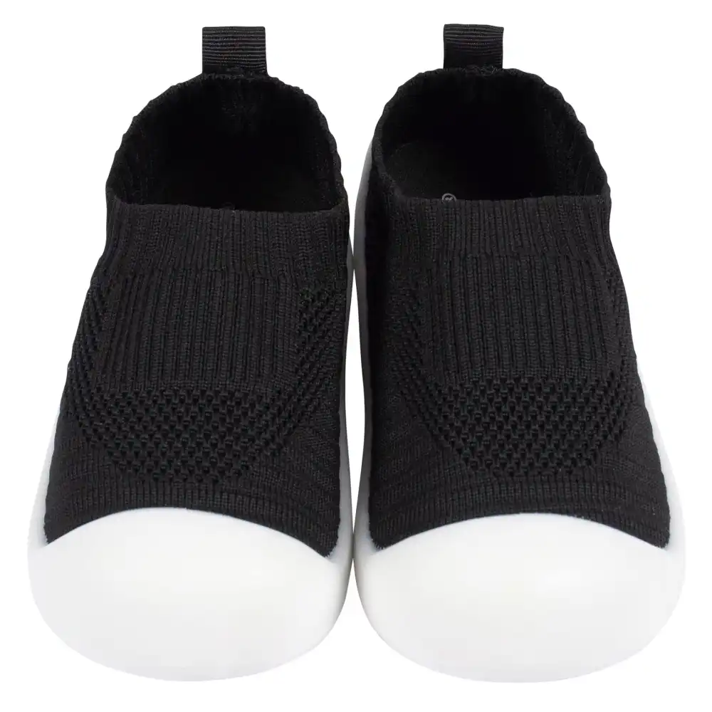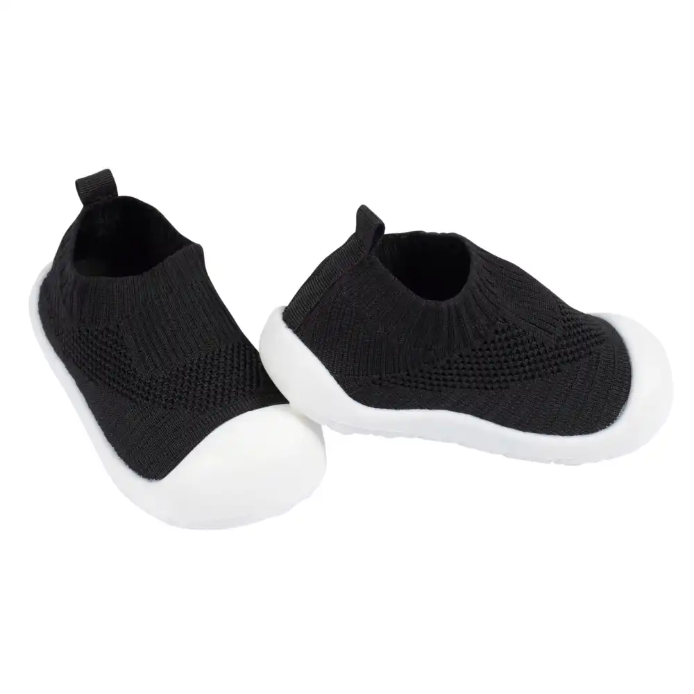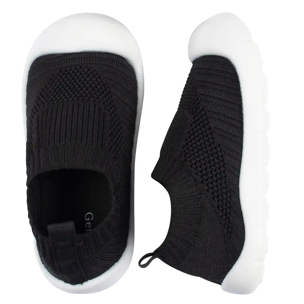 A comfortable shoe makes all the difference when your little one is learning to walk. A stretchy knit top gives this shoe a super light feel while a rubber sole provides protection and aids balance. Slips on easily for young hands learning to dress themselves. Pack includes one pair of black slip-on shoes.