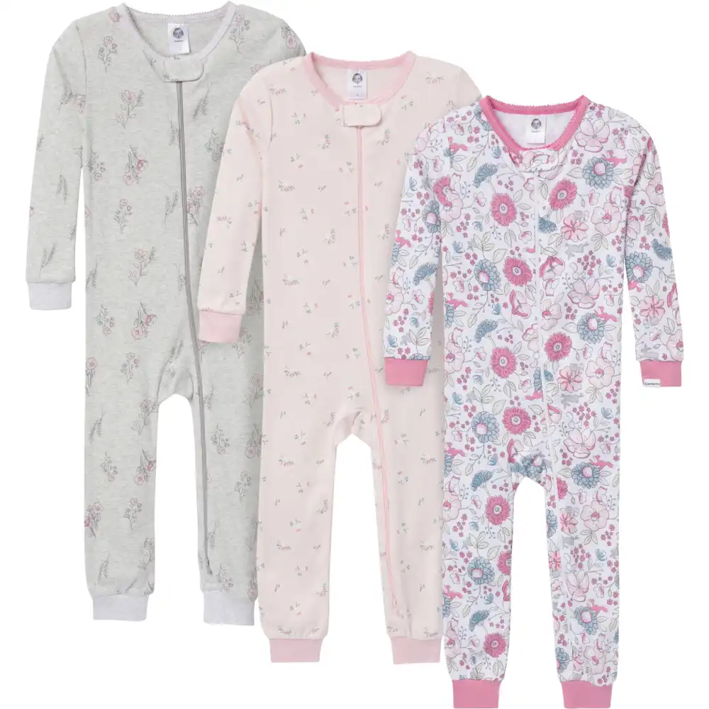 3-Pack Baby & Toddler Girls Woodland Floral Snug Fit Footless Pajamas